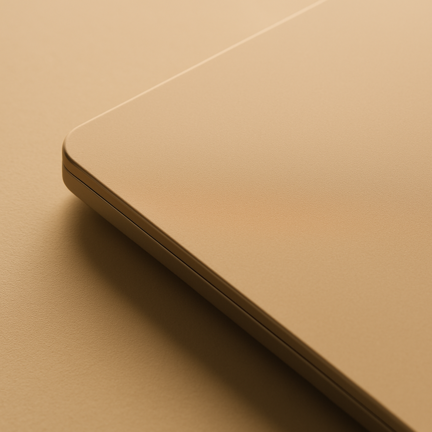 Close-up of a matte gold laptop corner with rounded edges, showcasing its premium design and seamless finish against a matching gold background.