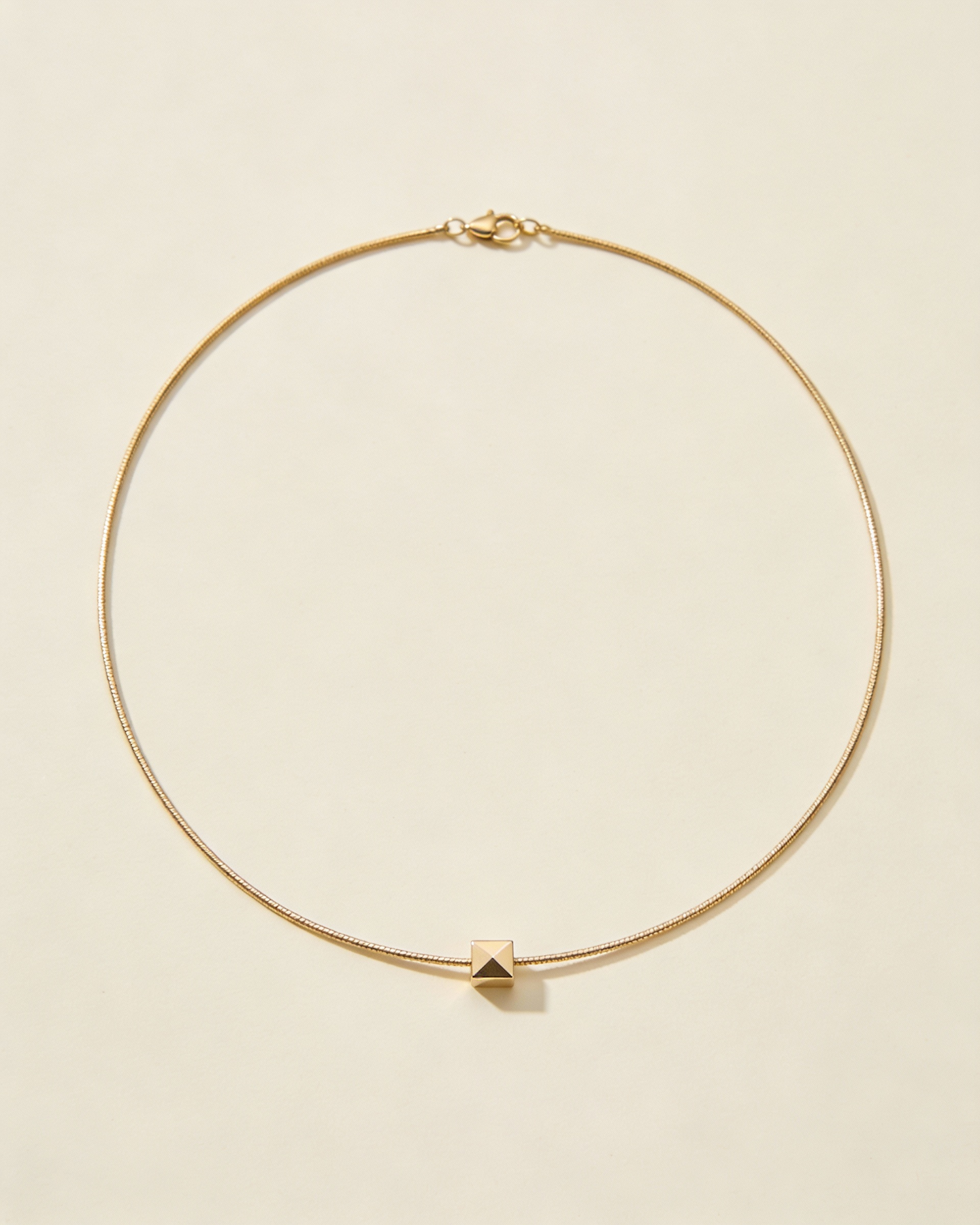 Minimalist gold necklace with a geometric pyramid pendant, displayed on a neutral background, perfect for modern and elegant styling.