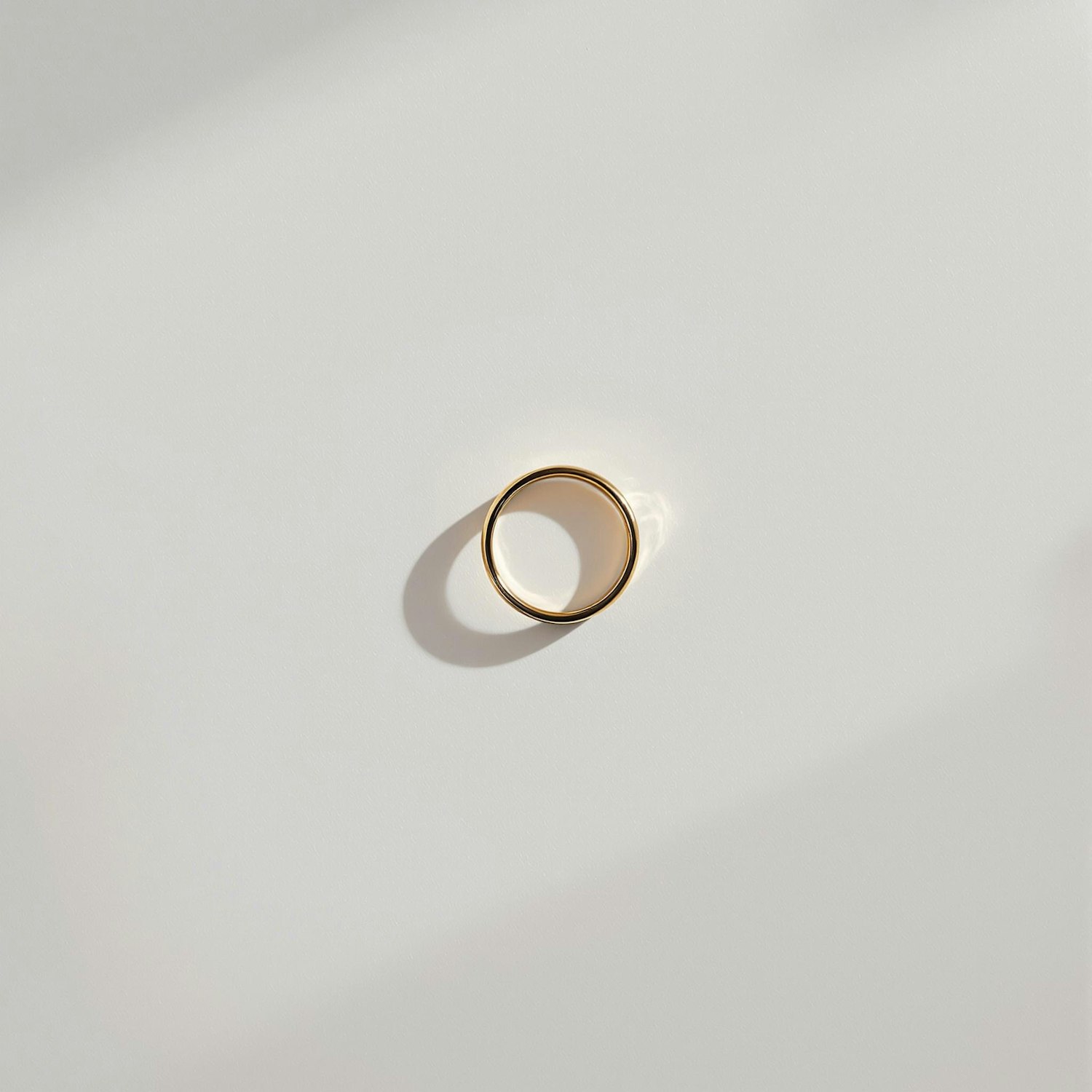 Minimalist gold ring on a smooth beige surface with soft shadows, creating a clean and elegant aesthetic.