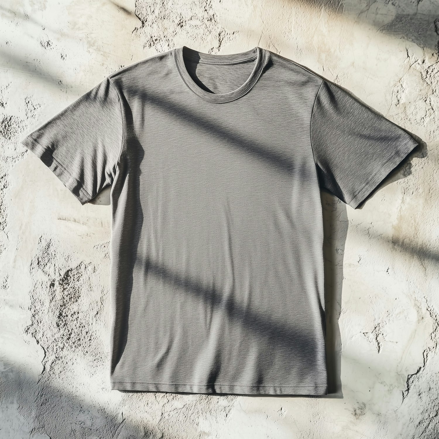 Minimalist light gray t-shirt on a textured concrete surface with soft shadows and natural lighting for a clean, modern look.