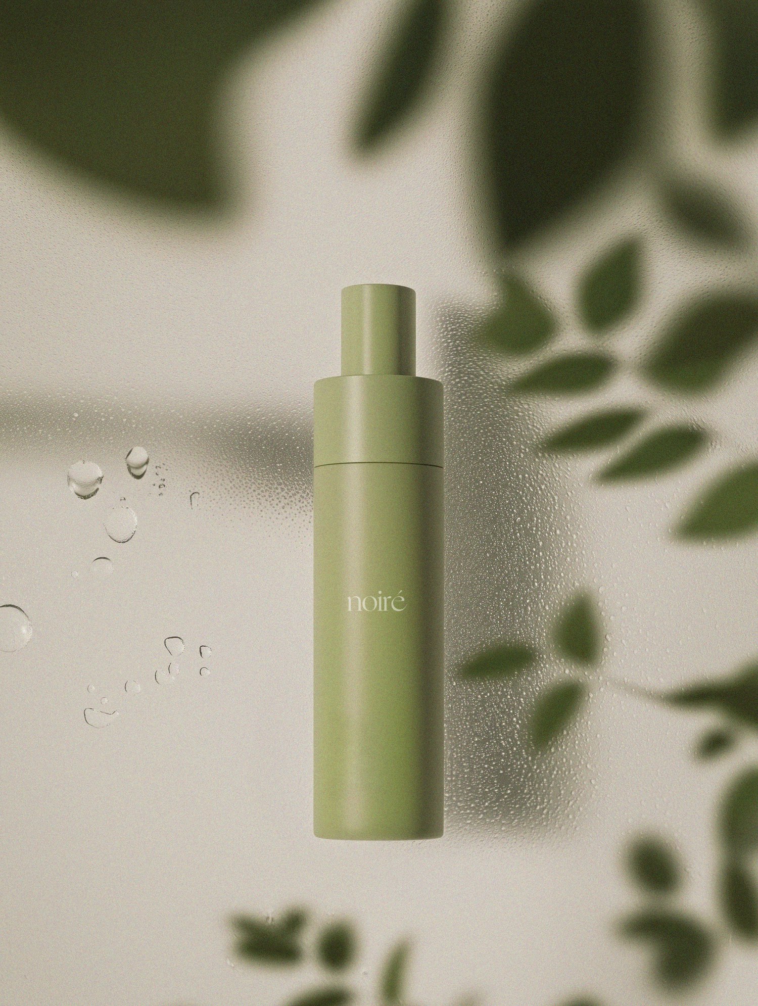Minimalist green bottle with 'noiré' branding, set against a frosted glass background with water droplets and leafy shadows.