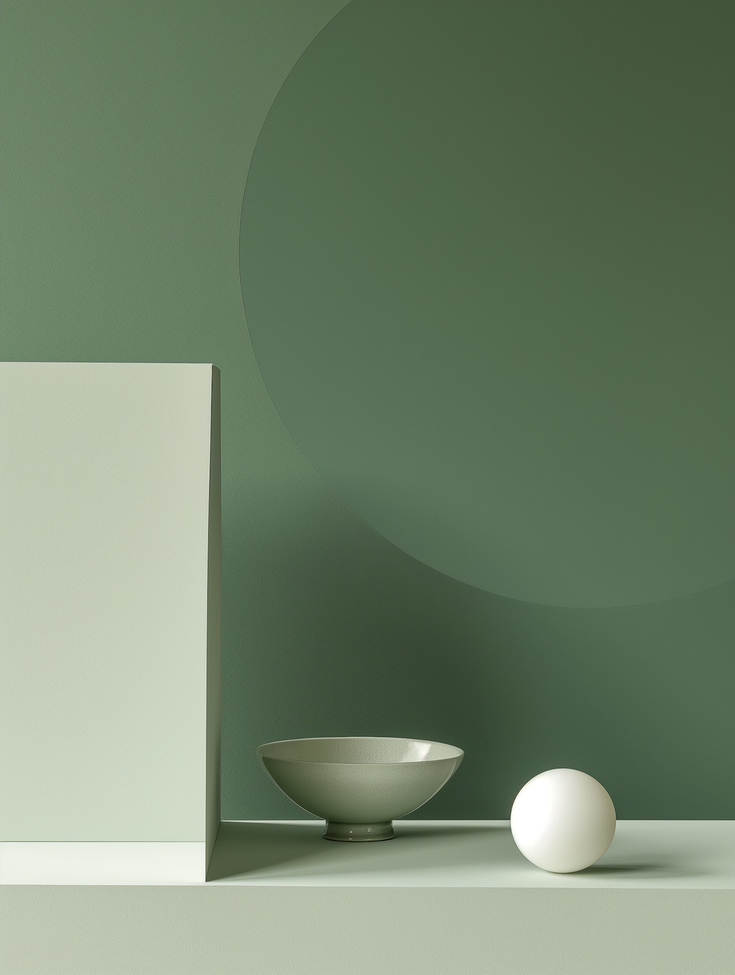 Minimalist green composition with a bowl, sphere, and geometric shapes. Elegant use of monochromatic tones and simple forms.