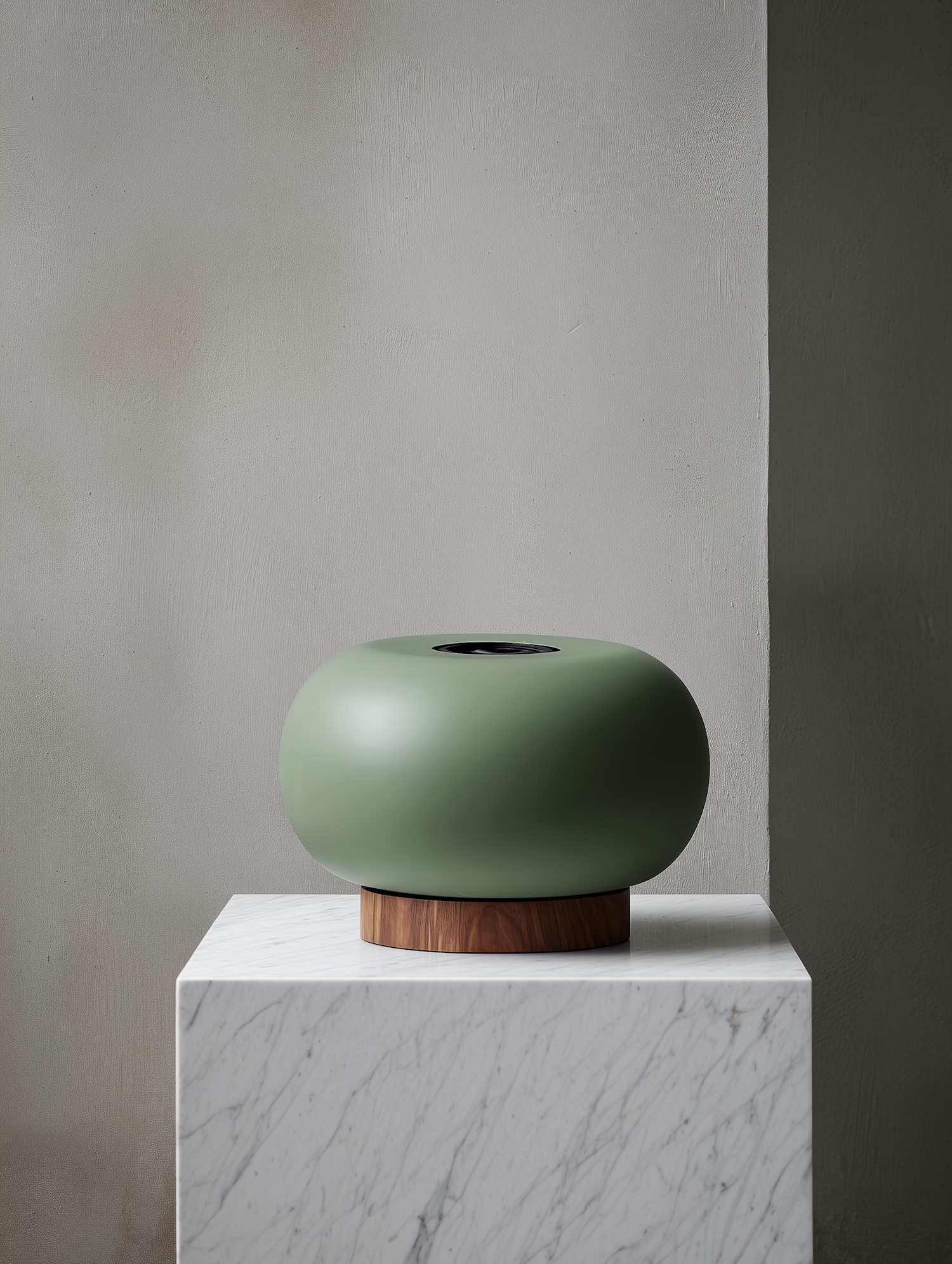 A sleek green decorative object on a wooden base, placed on a white marble pedestal against a neutral textured wall.