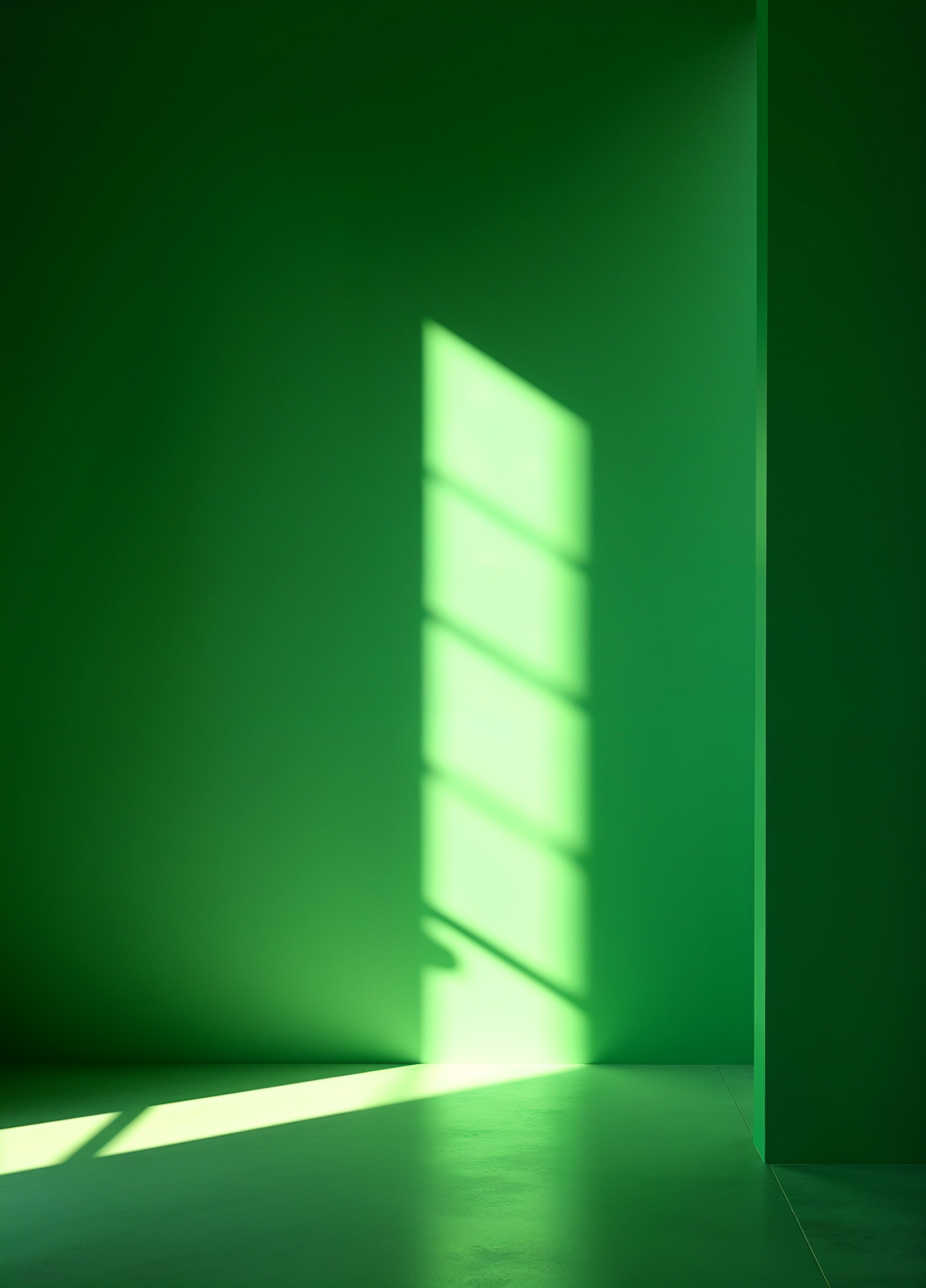 Minimalist green interior with sunlight casting window shadows on the wall and floor, creating a serene and modern aesthetic.