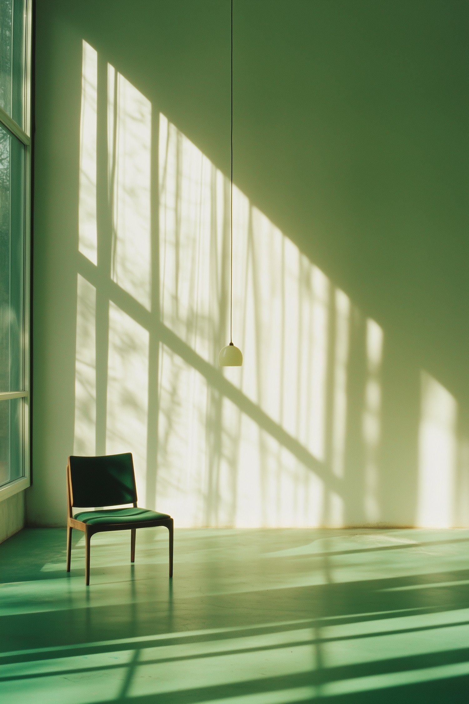 Minimalist room with a green chair, sunlight streaming through windows, and dramatic shadows on green walls and floor.