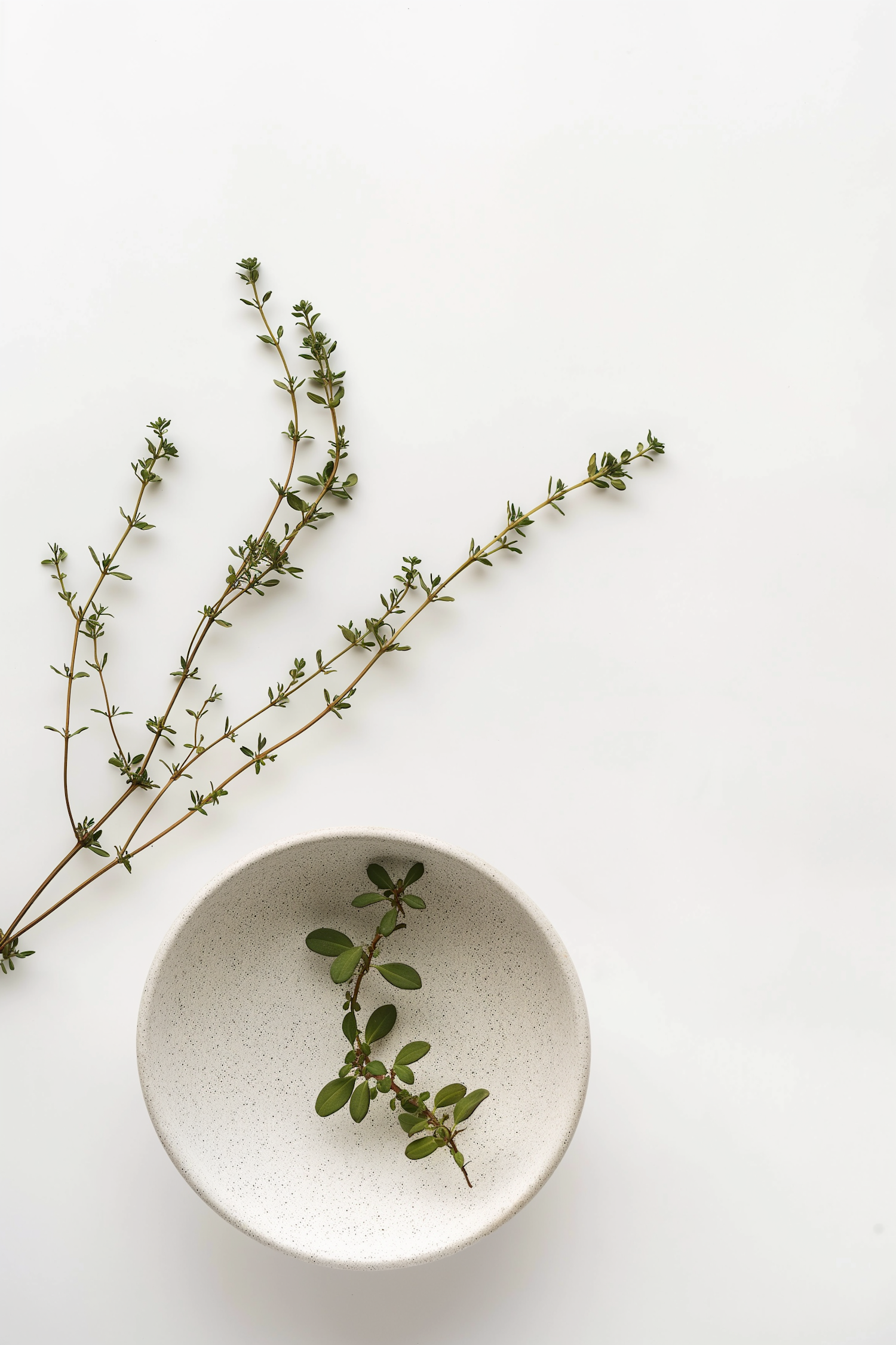 Minimalist scene with a white bowl and green sprigs on a light background, highlighting natural elegance and simplicity.
