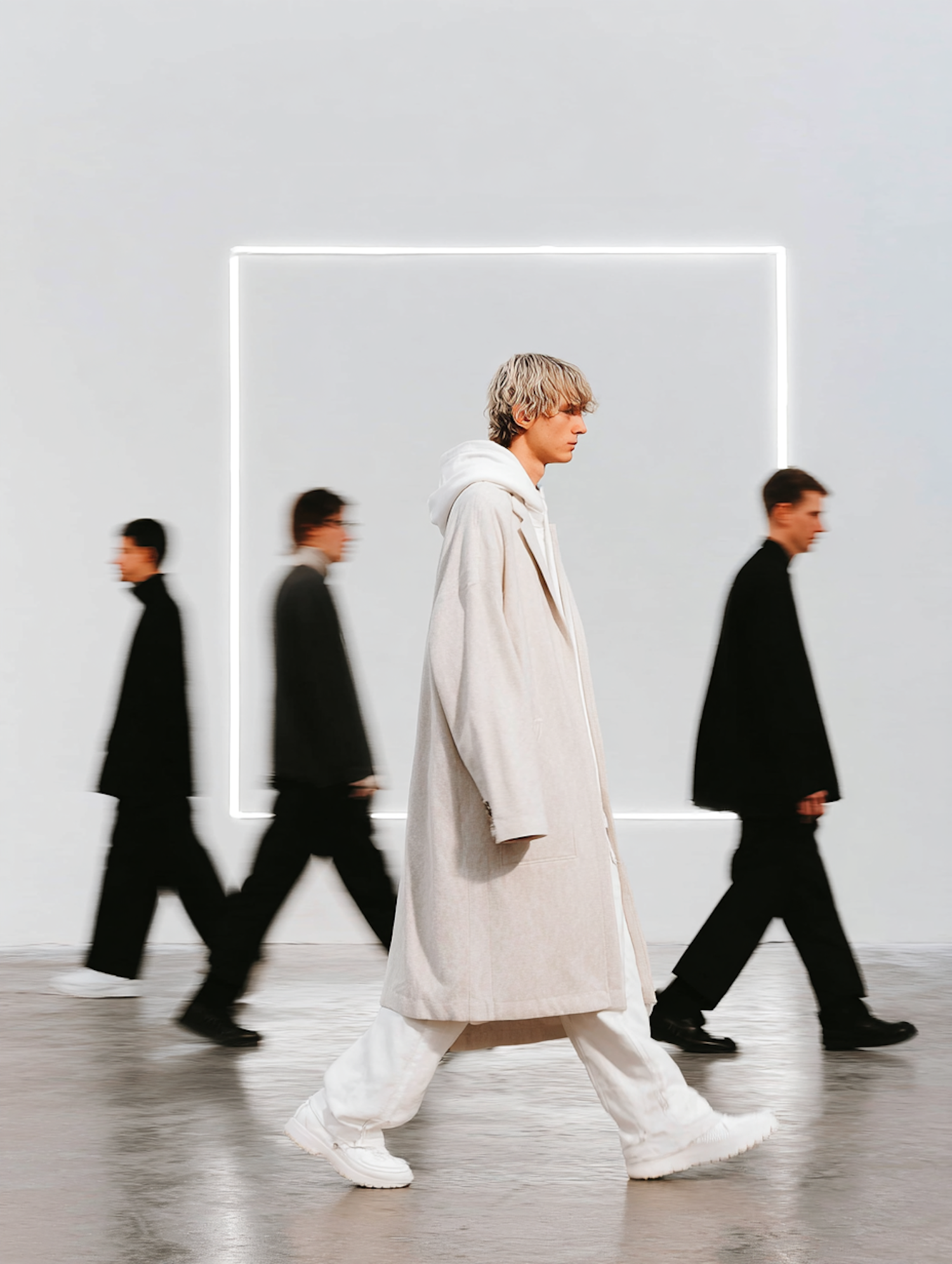 Stylish individuals walking in a minimalist setting with a glowing rectangular backdrop, highlighting modern fashion and design.