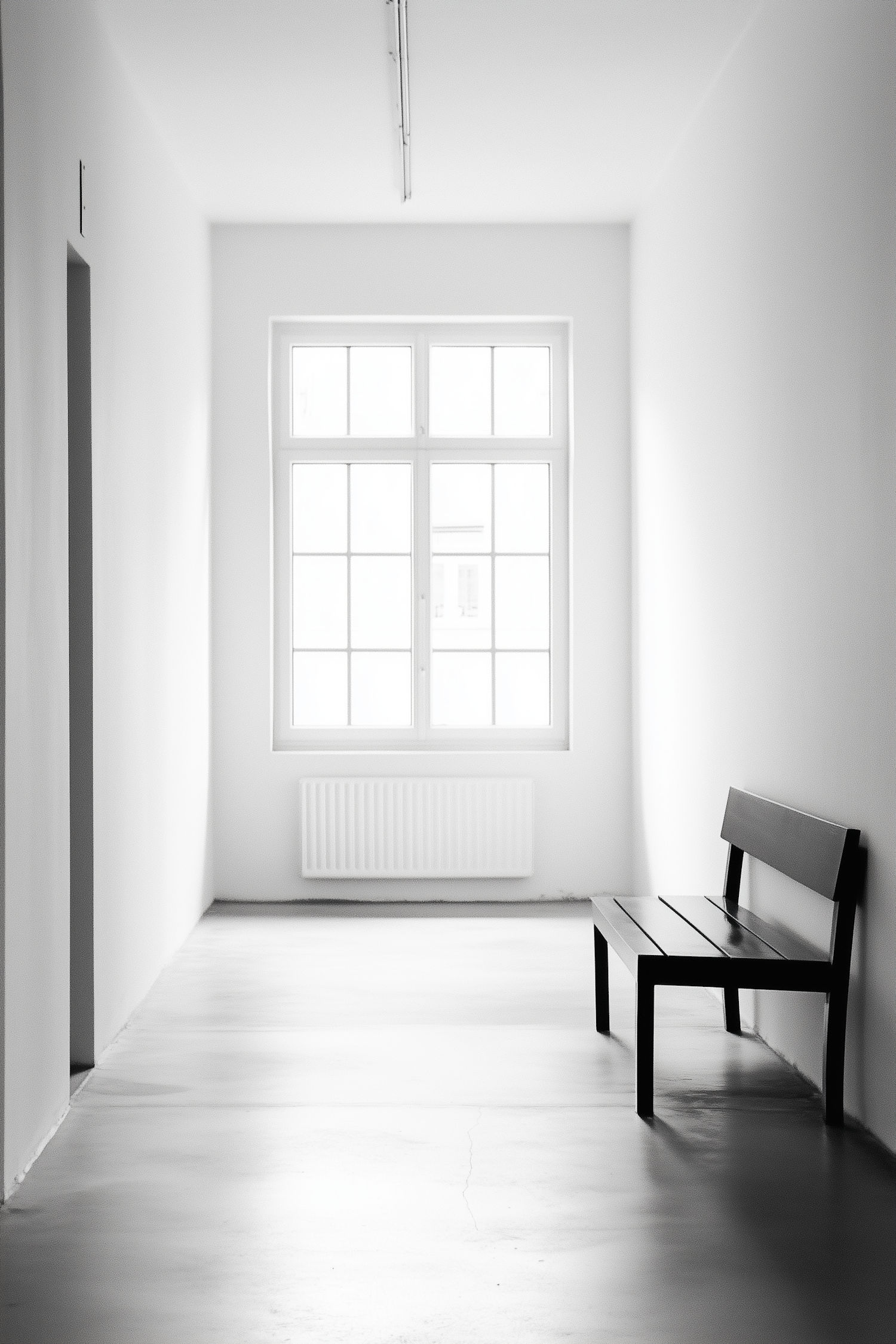 Minimalist hallway with white walls, large window, and black bench. Bright, airy space with modern design elements.