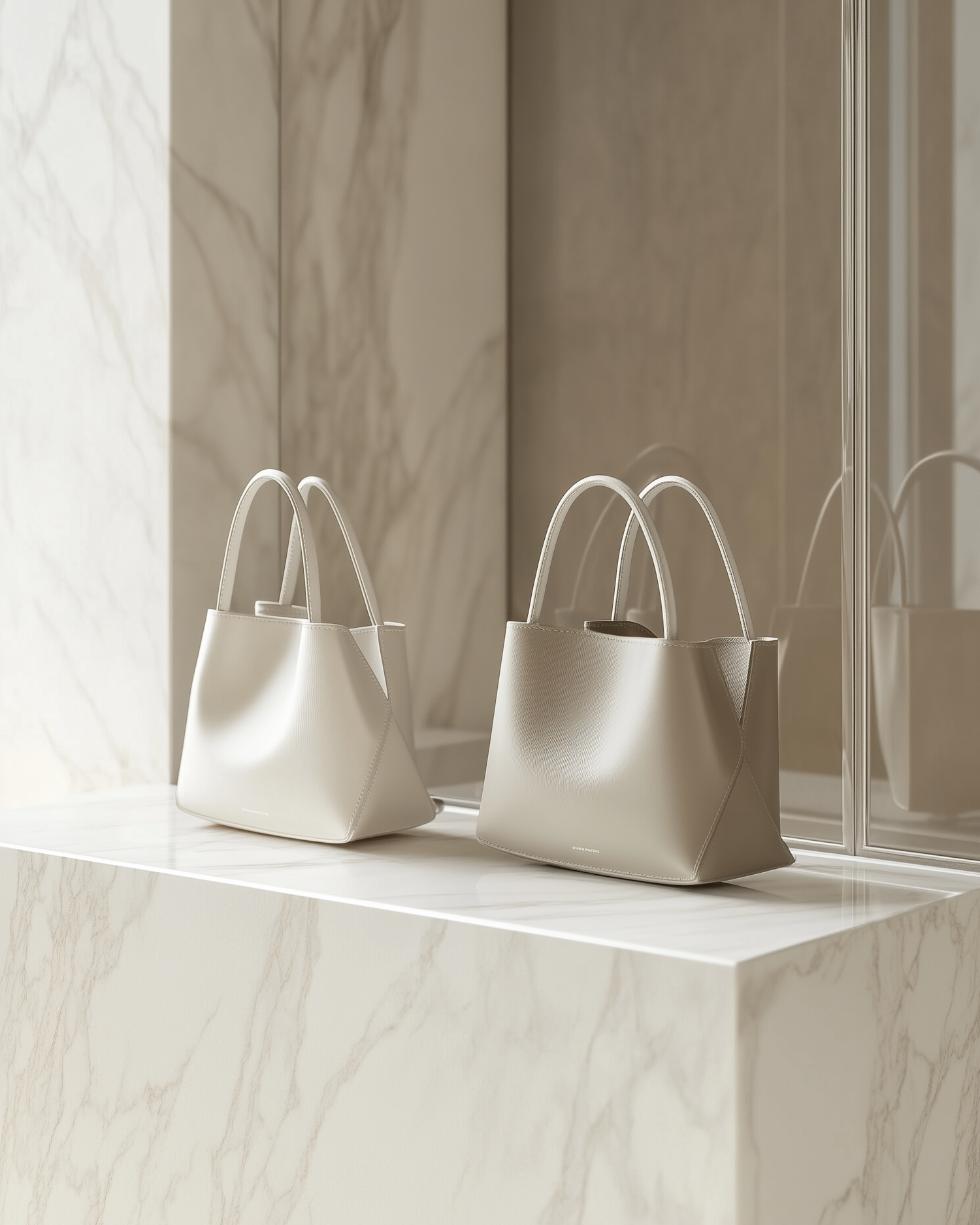 Elegant beige leather handbags on a polished marble surface with a mirrored backdrop, showcasing minimalist luxury and clean design.