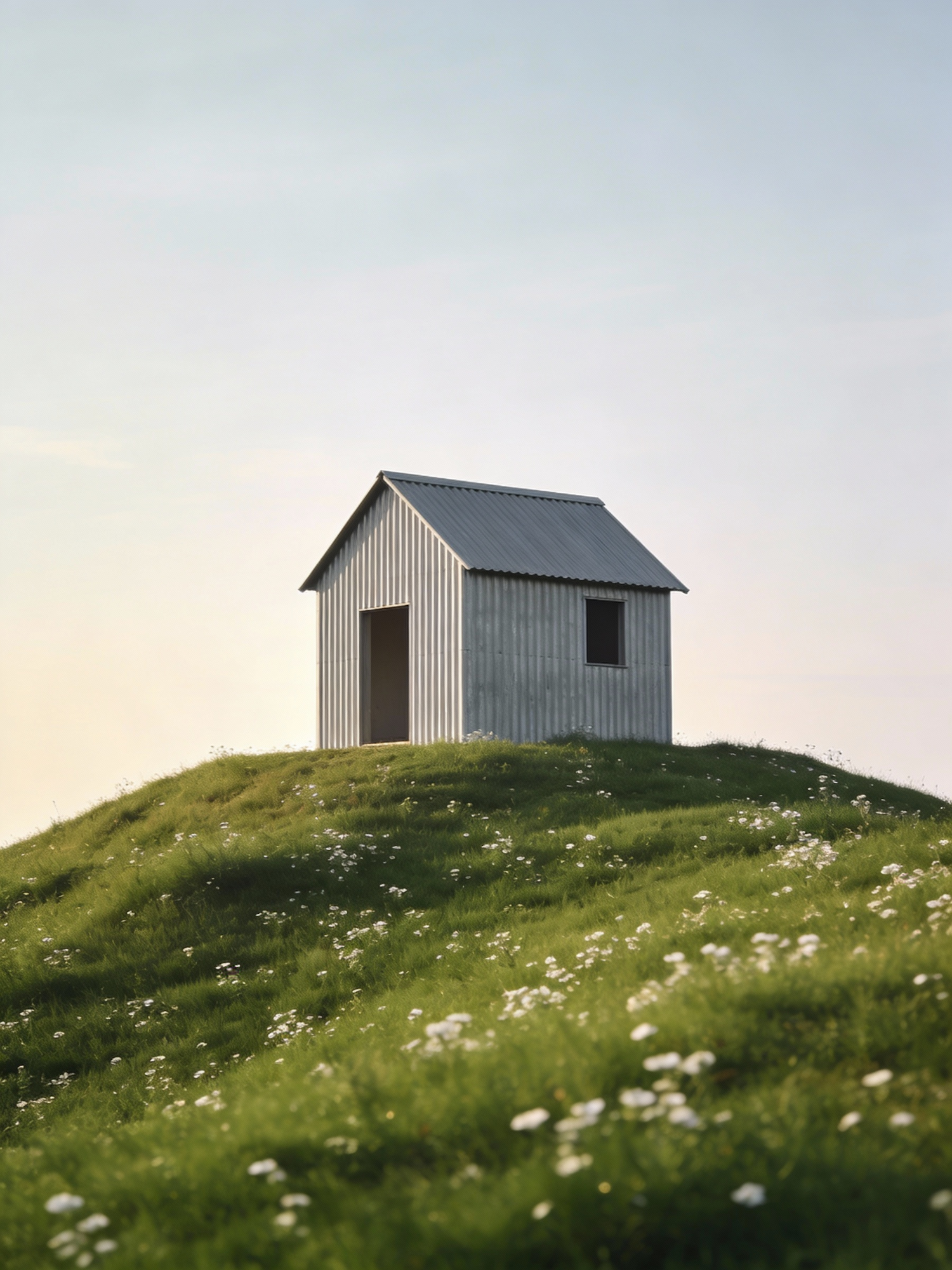 A minimalist corrugated-metal tiny cabin standing alone on top of a gentle green hill, viewed from a distance; soft gray metal texture, simple gable roof, minimal openings, clean silhouette. Soft realistic grass and tiny white flowers across the hill. Natural warm light, clear sky, subtle atmospheric depth. Serene balanced composition emphasizing simplicity and scale. No road, no fence, no trees, no other buildings. Ultra detailed, cinematic lighting, 8k, realistic texture, minimal design aesthetic.