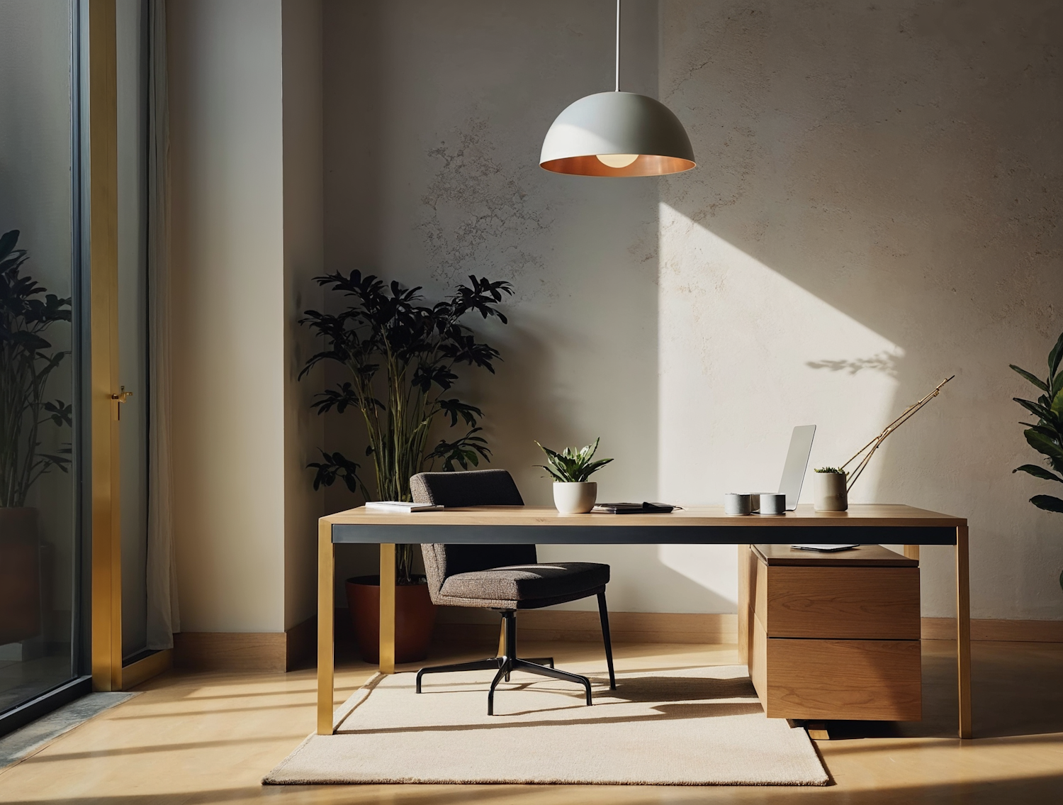 Minimalist home office with a wooden desk, potted plants, and warm natural light streaming through a glass door.