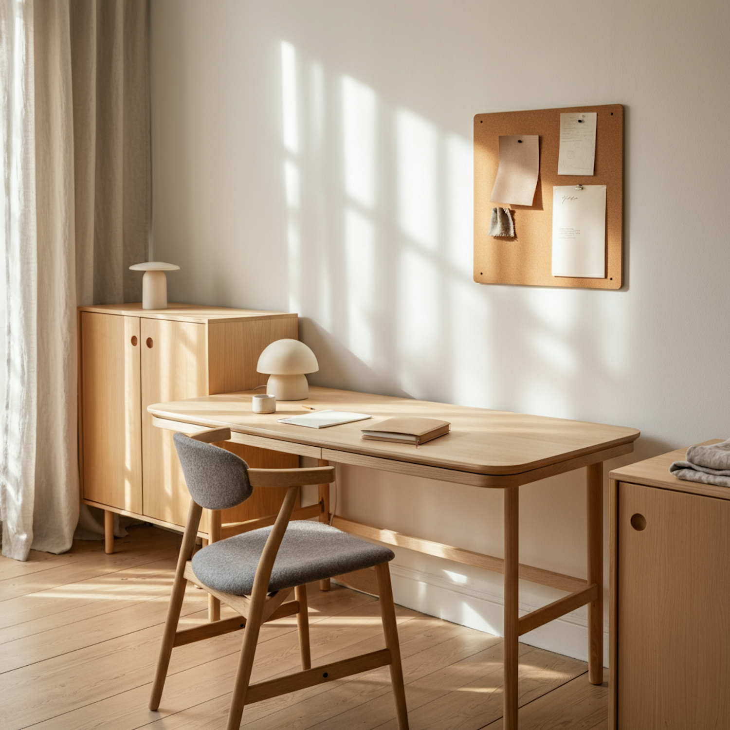 Minimalist home office with a wooden desk, gray chair, corkboard, and soft natural light filtering through beige curtains.