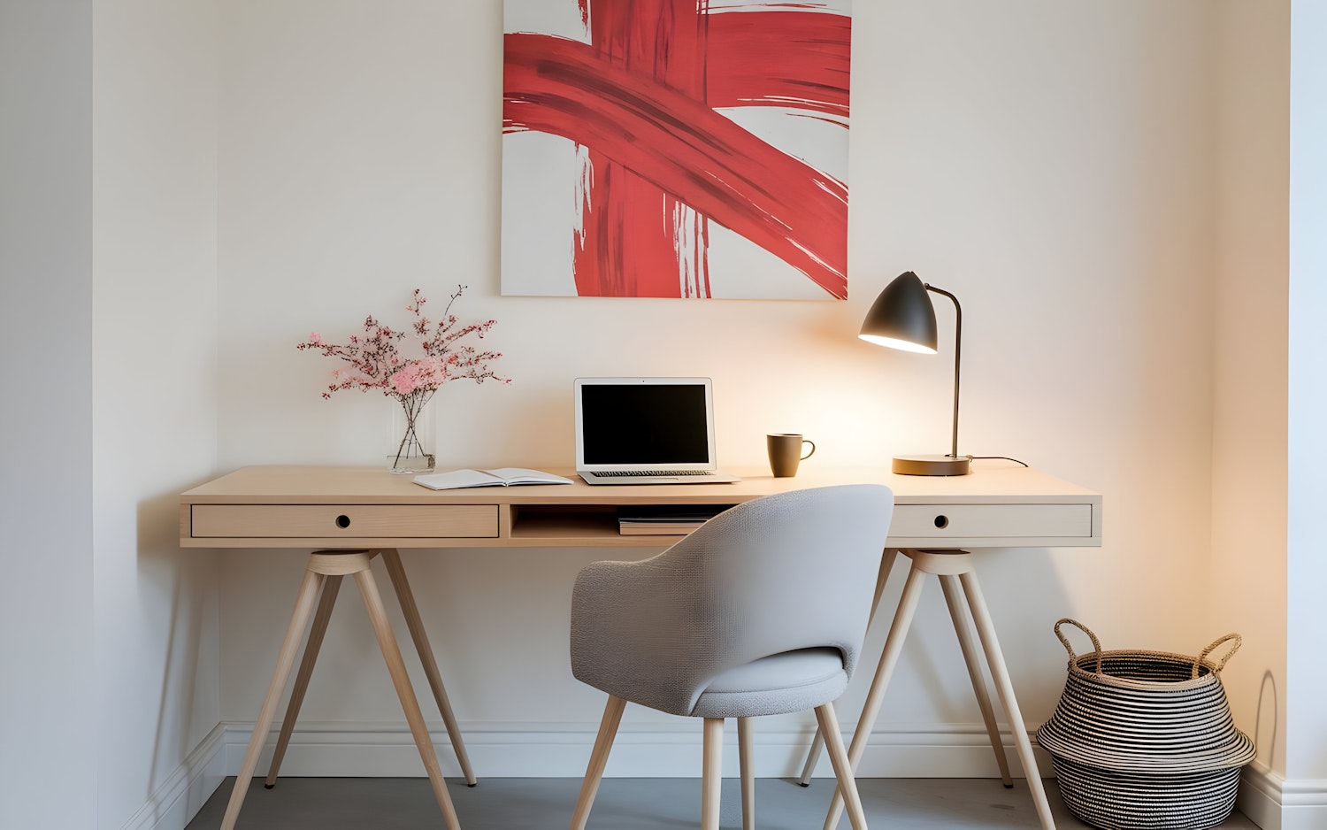 Minimalist home office with a wooden desk, gray chair, laptop, and pink flowers. A bold red abstract painting adds a modern touch.