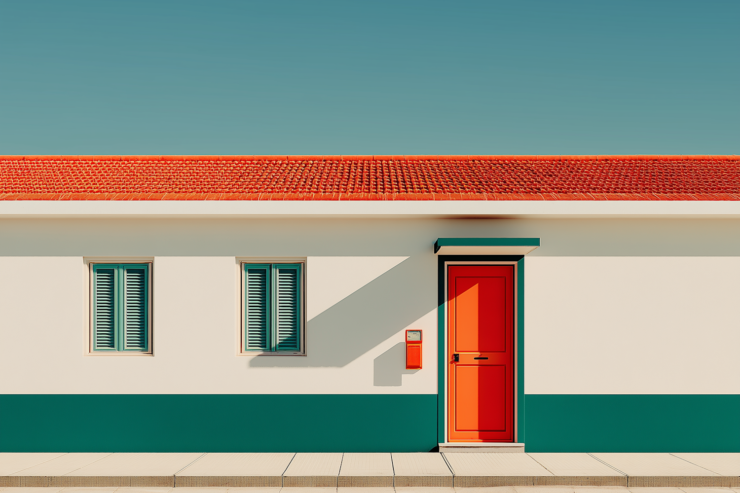 Minimalist house facade with a red door, green shutters, and a red-tiled roof against a clear blue sky. Bold and vibrant design.