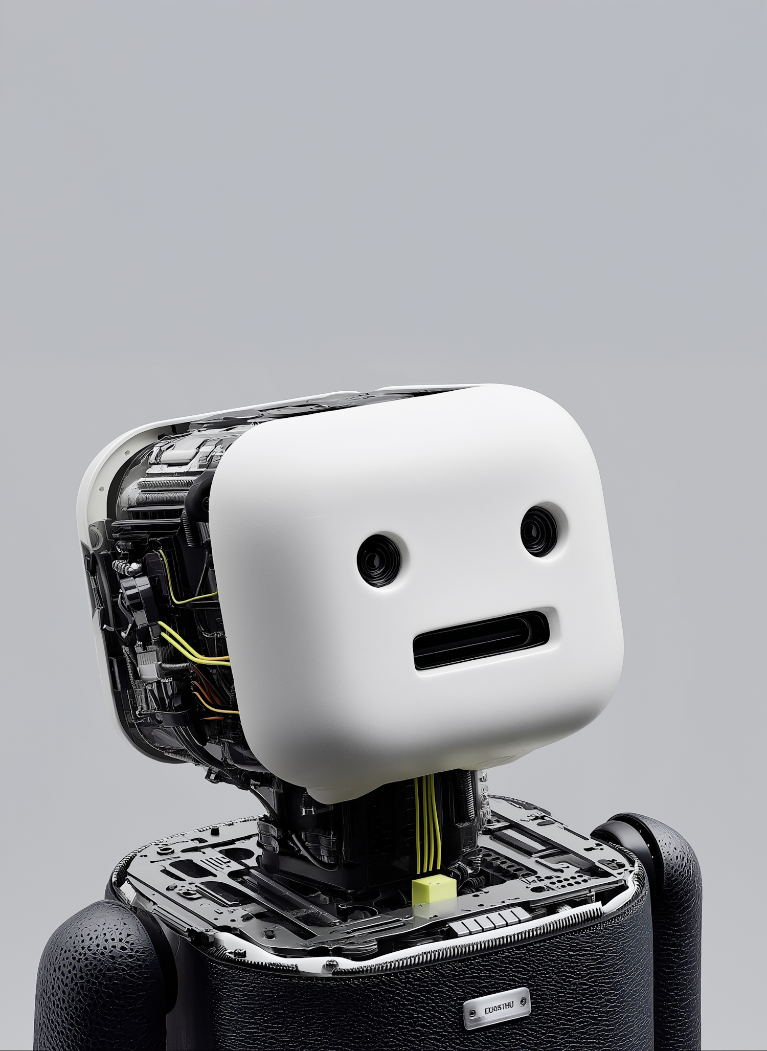 A minimalist humanoid robot with a white head and exposed internal components, set against a plain gray background.