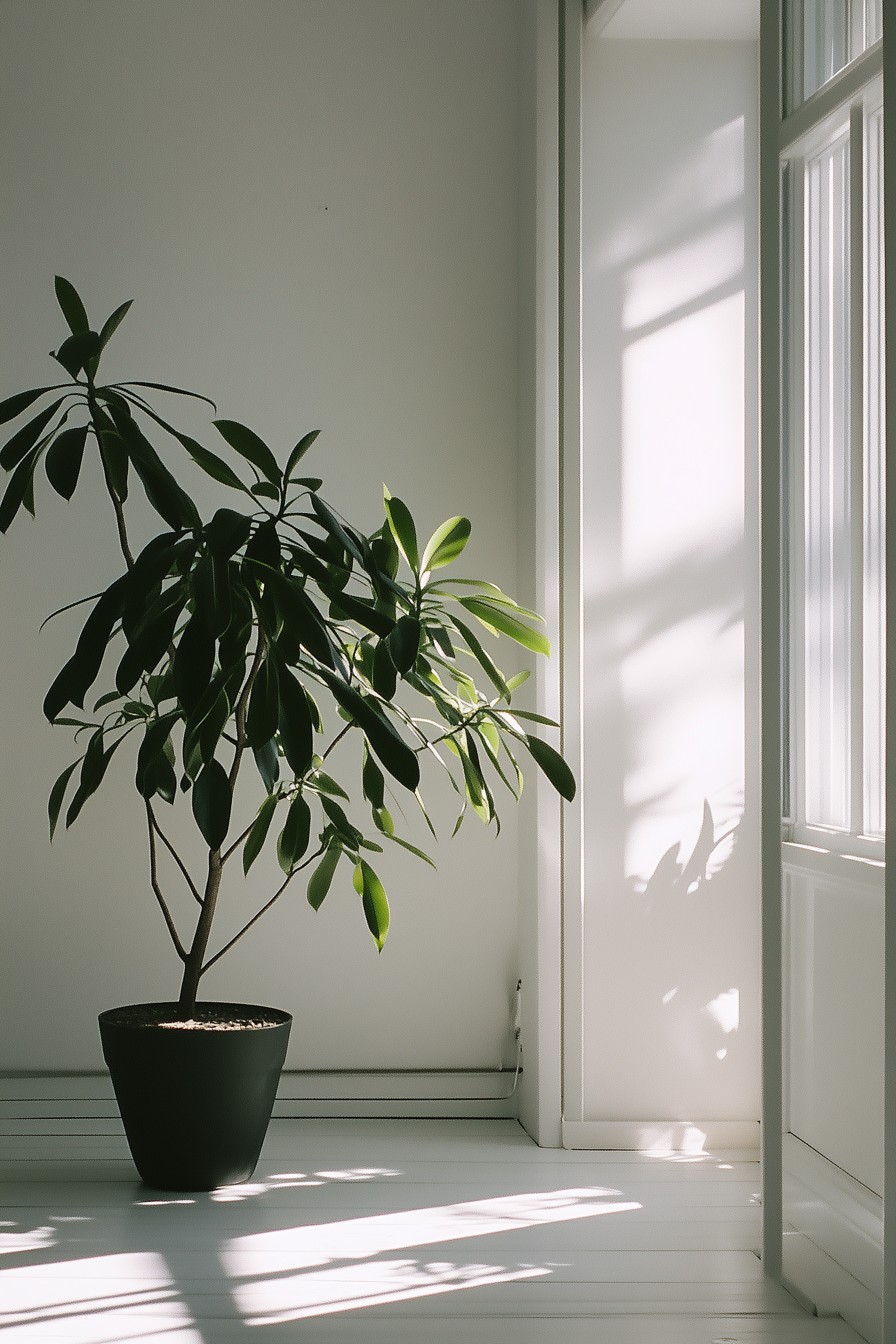A potted plant with vibrant green leaves sits on a white floor, bathed in natural sunlight streaming through a nearby window.