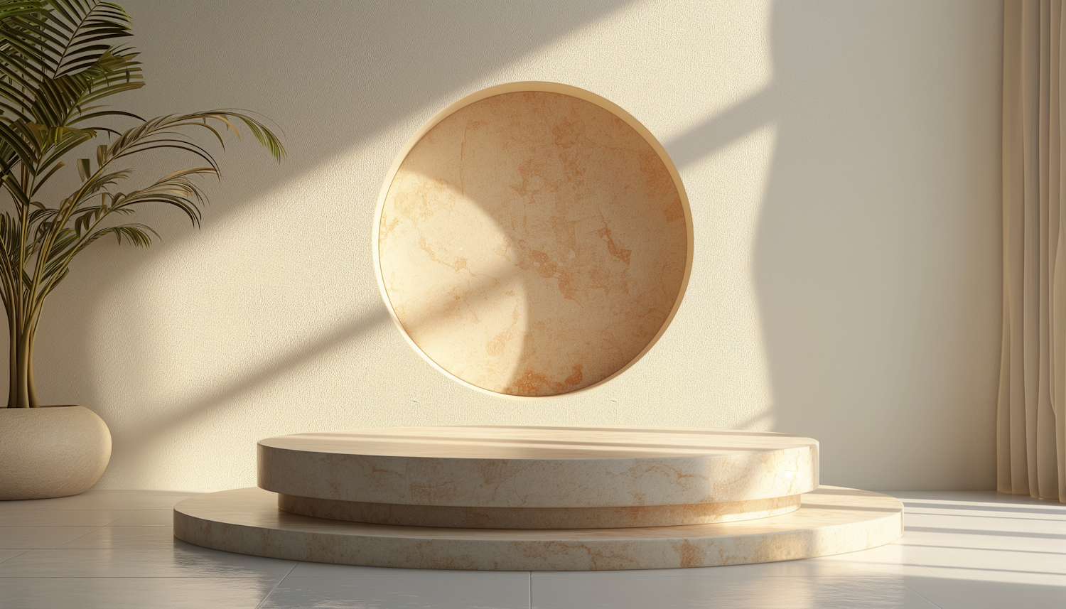 Minimalist interior with a circular marble platform, textured wall, and potted plant. Warm lighting creates a serene atmosphere.