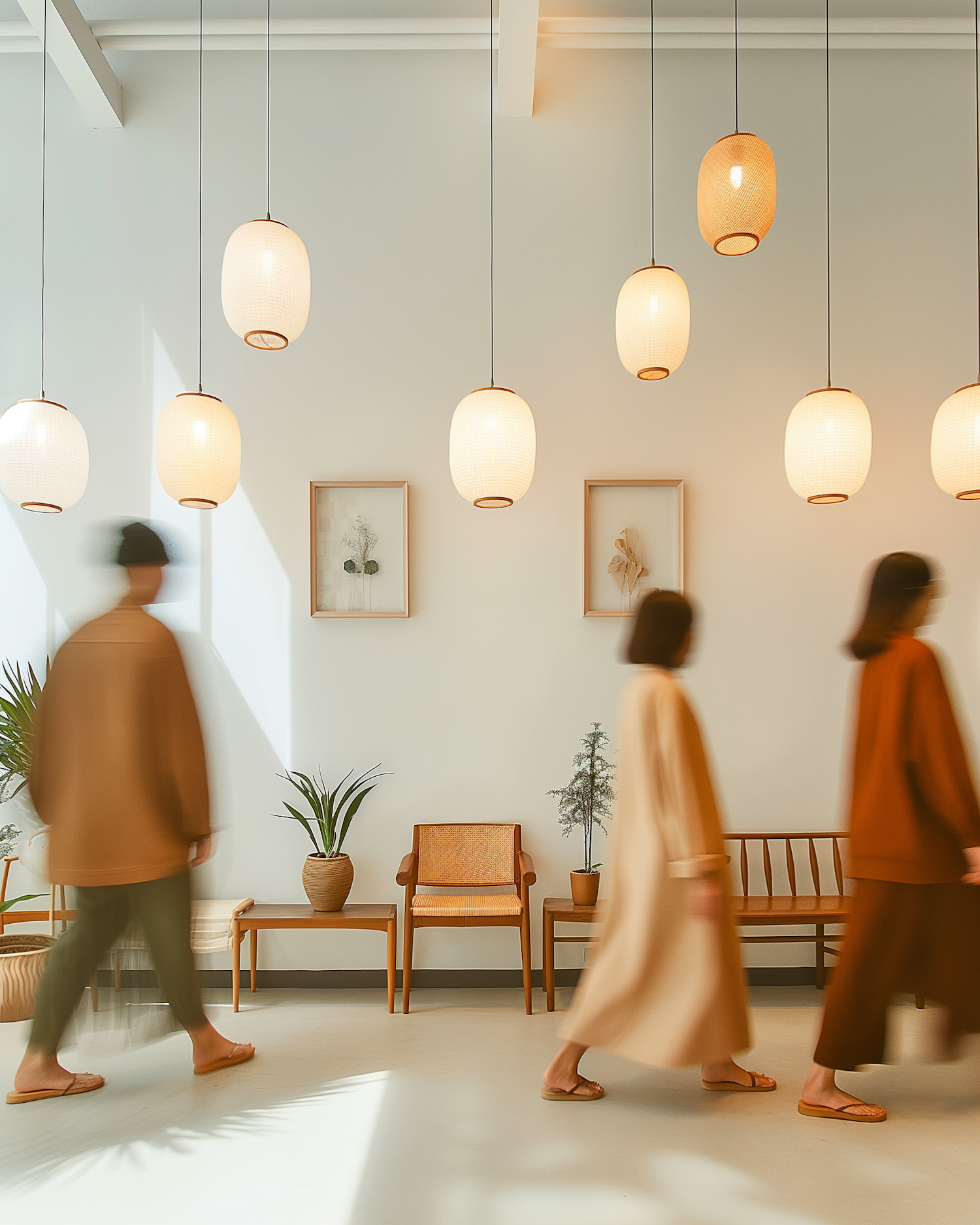 Minimalist room with wooden furniture, warm pendant lights, and blurred figures walking, creating a serene and modern aesthetic.