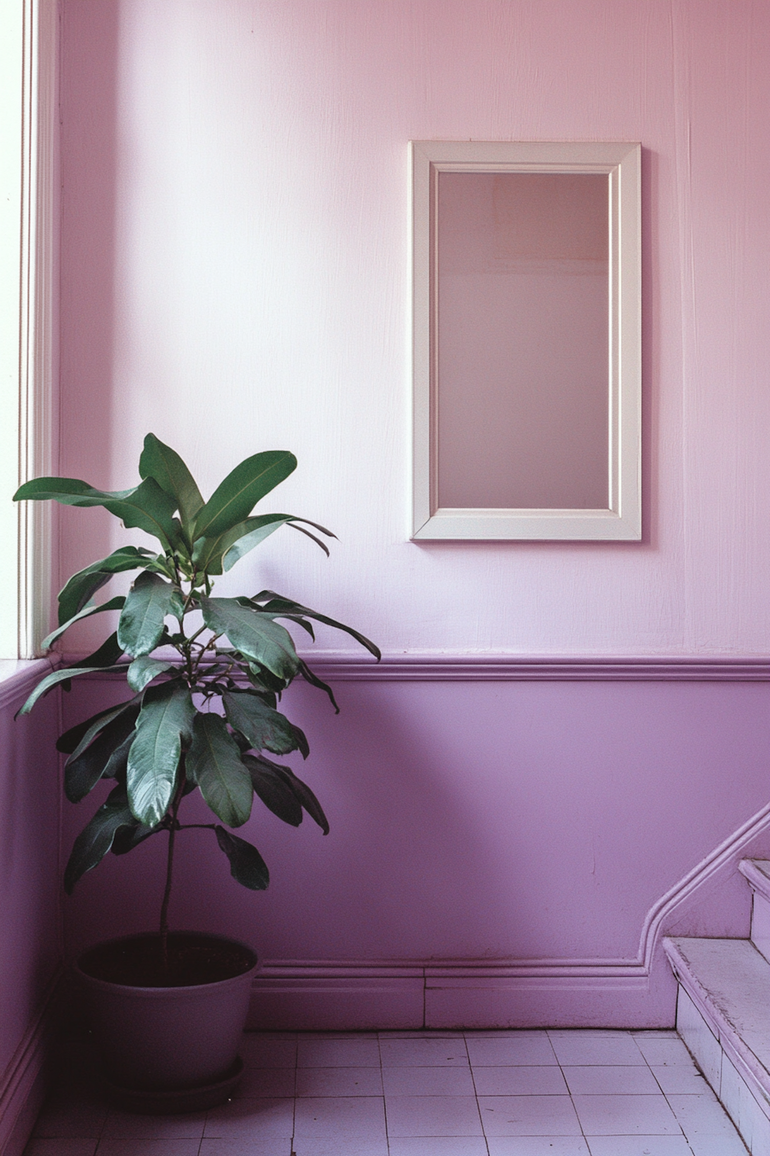 A pastel pink and lavender corner with a potted green plant, a white-framed mirror, and a staircase, creating a serene and stylish vibe.