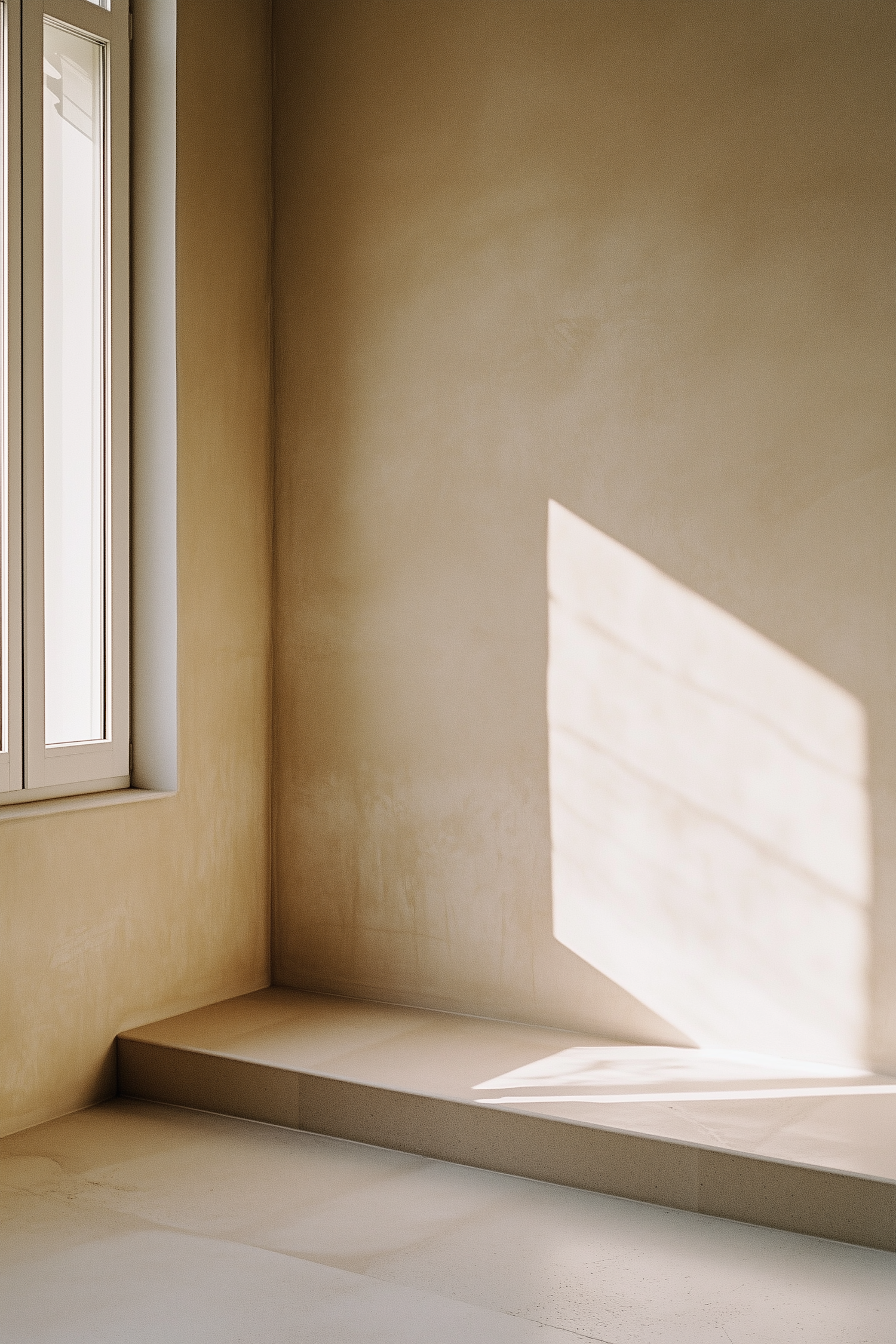 Minimalist room with warm sunlight casting shadows on a beige wall, creating a serene and calming atmosphere.
