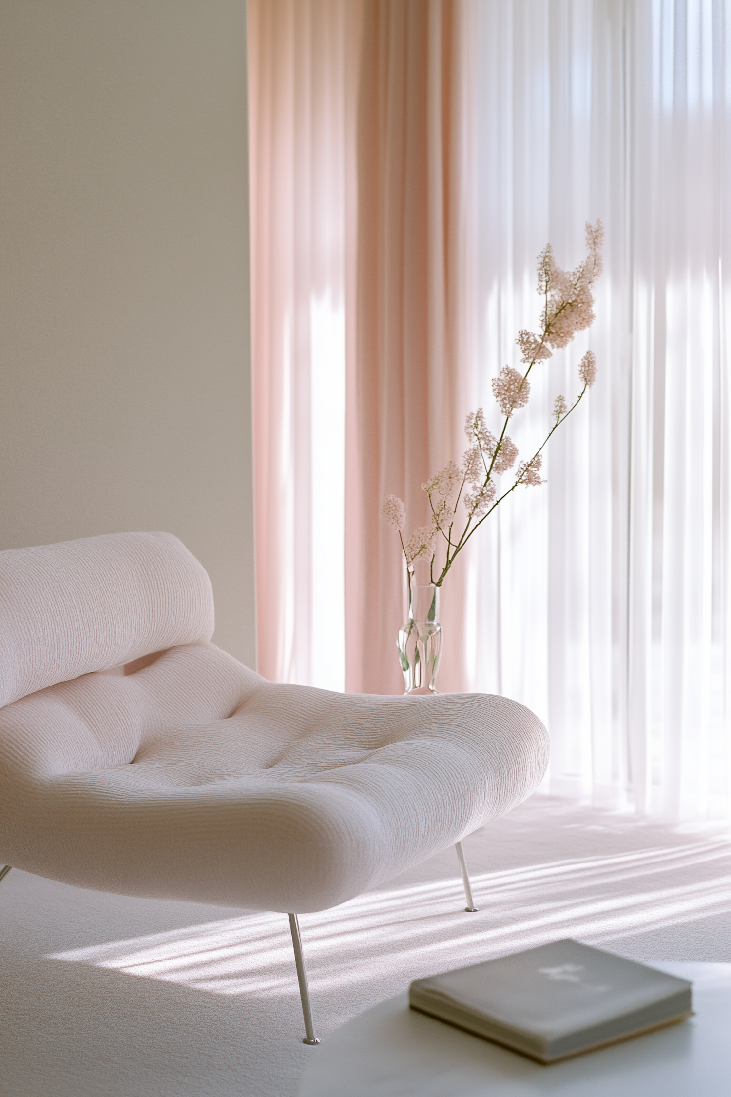 Minimalist interior with a soft blush lounge chair, sheer curtains, pink flowers in a vase, and a book on a white table.