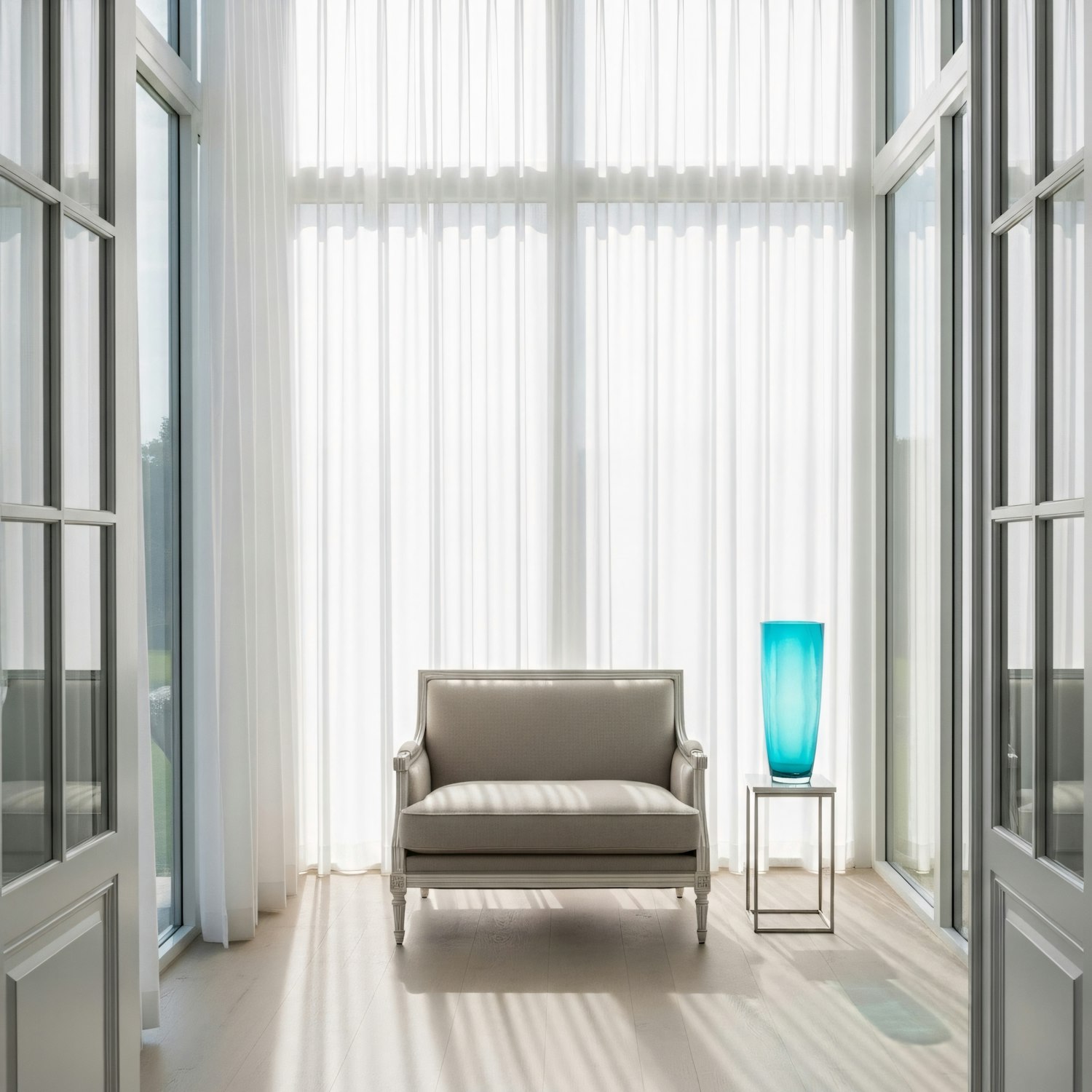 Minimalist interior with a beige loveseat, sheer white curtains, and a vibrant blue vase on a metallic side table, bathed in natural light.