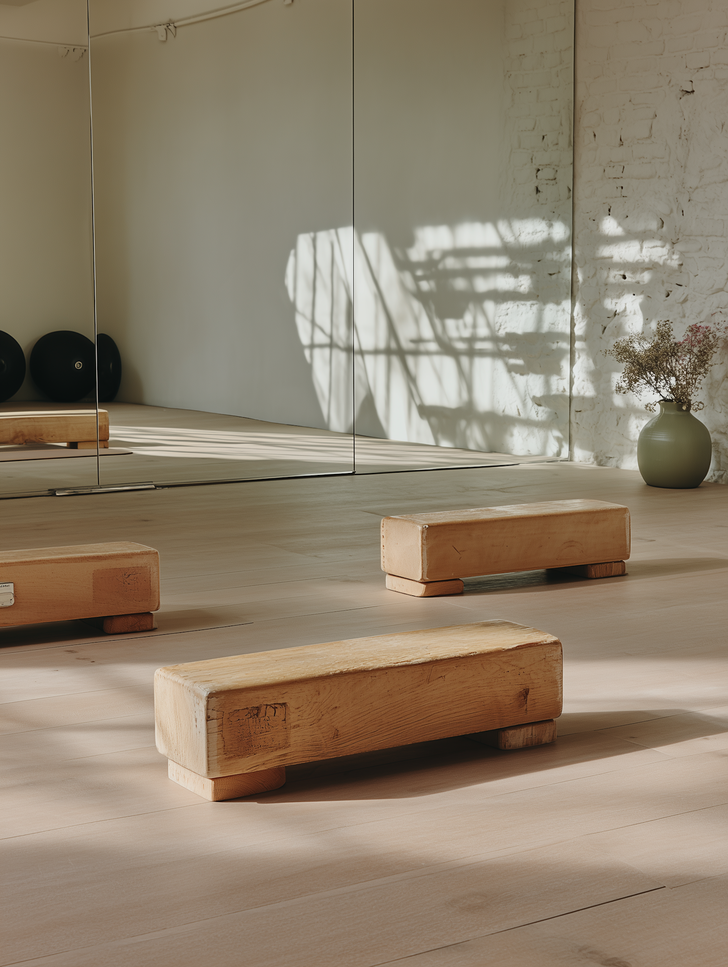 Minimalist interior with wooden blocks, a large mirror, and natural lighting creating a serene and warm atmosphere.