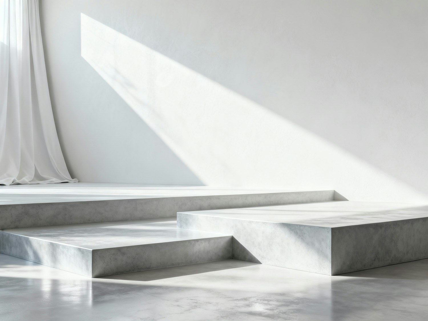 A hyper-realistic luxury studio setup, no products. The composition fills 80% of the frame with sculptural architectural geometry: a seamless white and soft-grey space where matte plaster meets polished micro-cement. Two to three elevated platforms form a rhythmic stage—rectilinear, clean-edged, perfectly balanced within the frame. Lighting is refined daylight through a large scrim from 45° left, producing long controlled shadows and bright highlights on edges. The surfaces are satin-matte, subtly reflective; faint bloom around the brightest planes gives cinematic realism. Palette: white, pale silver, neutral shadow grey. Shot on a full-frame 70 mm lens, f/5.6, 16:9 aspect ratio, camera at table height for a hero perspective. The mood is sculptural, serene, and editorial—modern luxury reduced to light, form, and silence