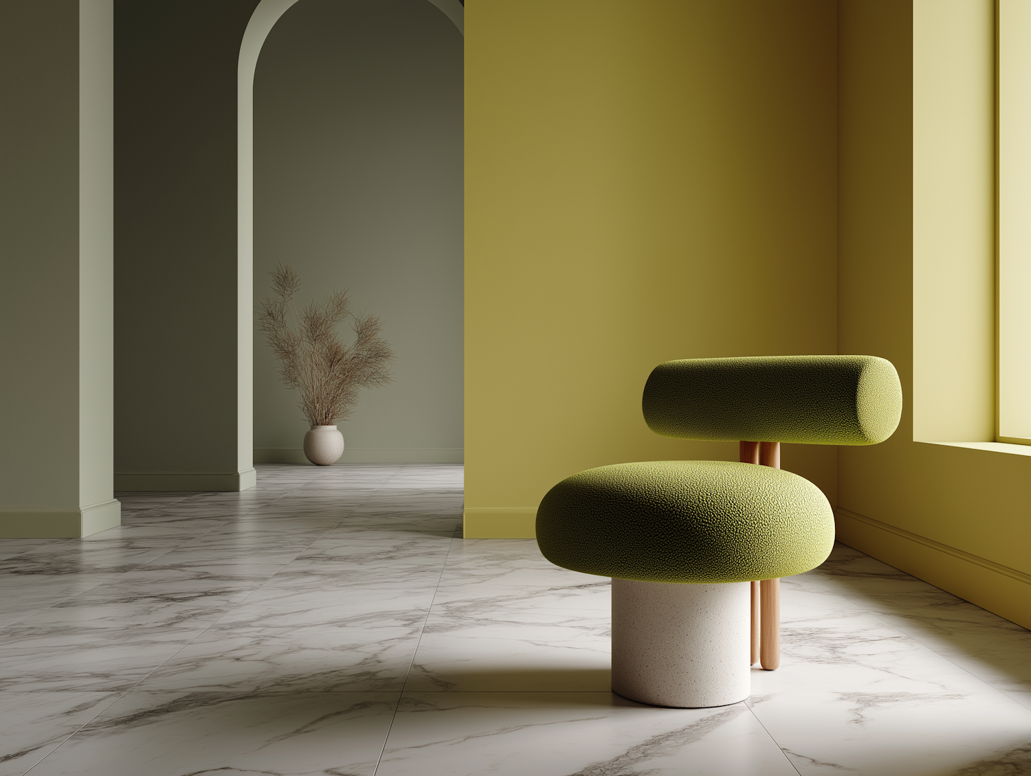 Minimalist interior with a green chair, marble flooring, and muted green and yellow walls, featuring an arched doorway and natural light.