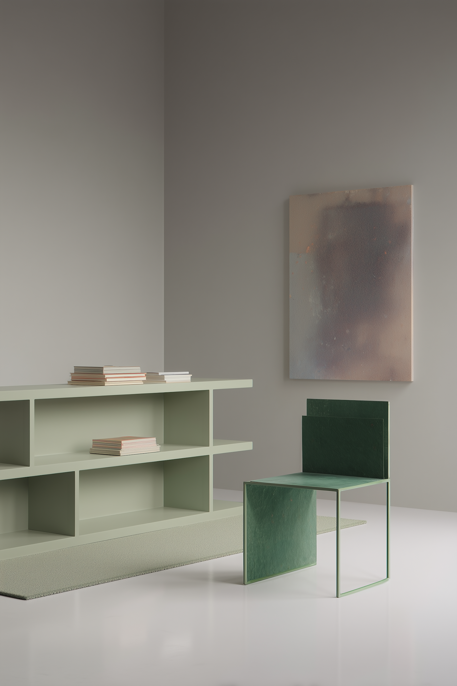Minimalist interior with a green shelving unit, modern green chair, and abstract wall art on a neutral gray background.