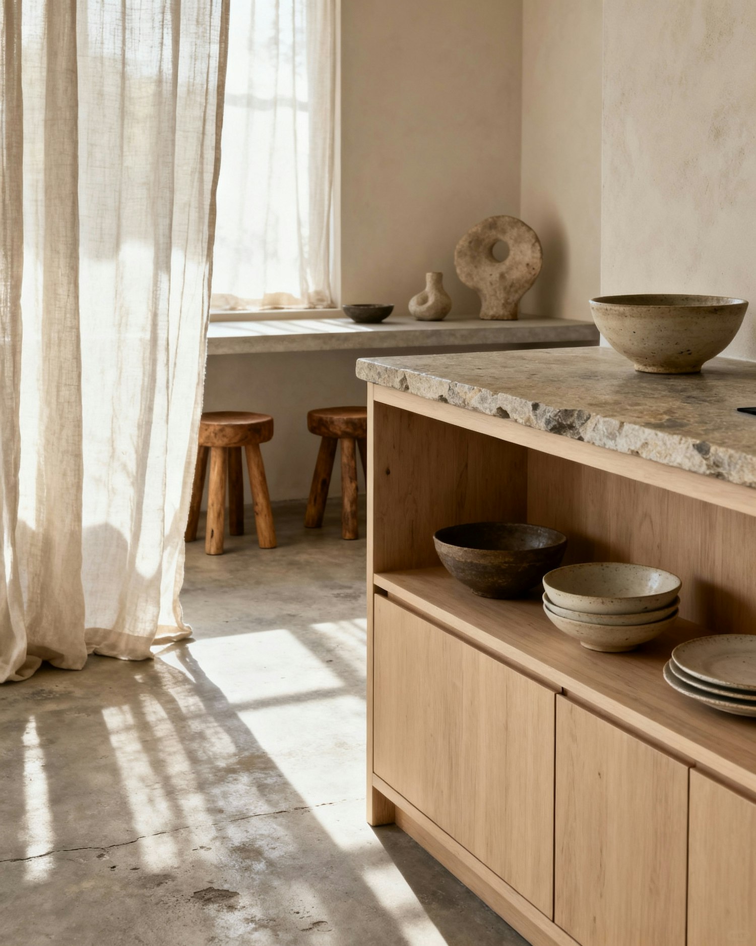 Minimalist interior with natural wood, stone accents, and soft sunlight filtering through sheer curtains, creating a serene atmosphere.