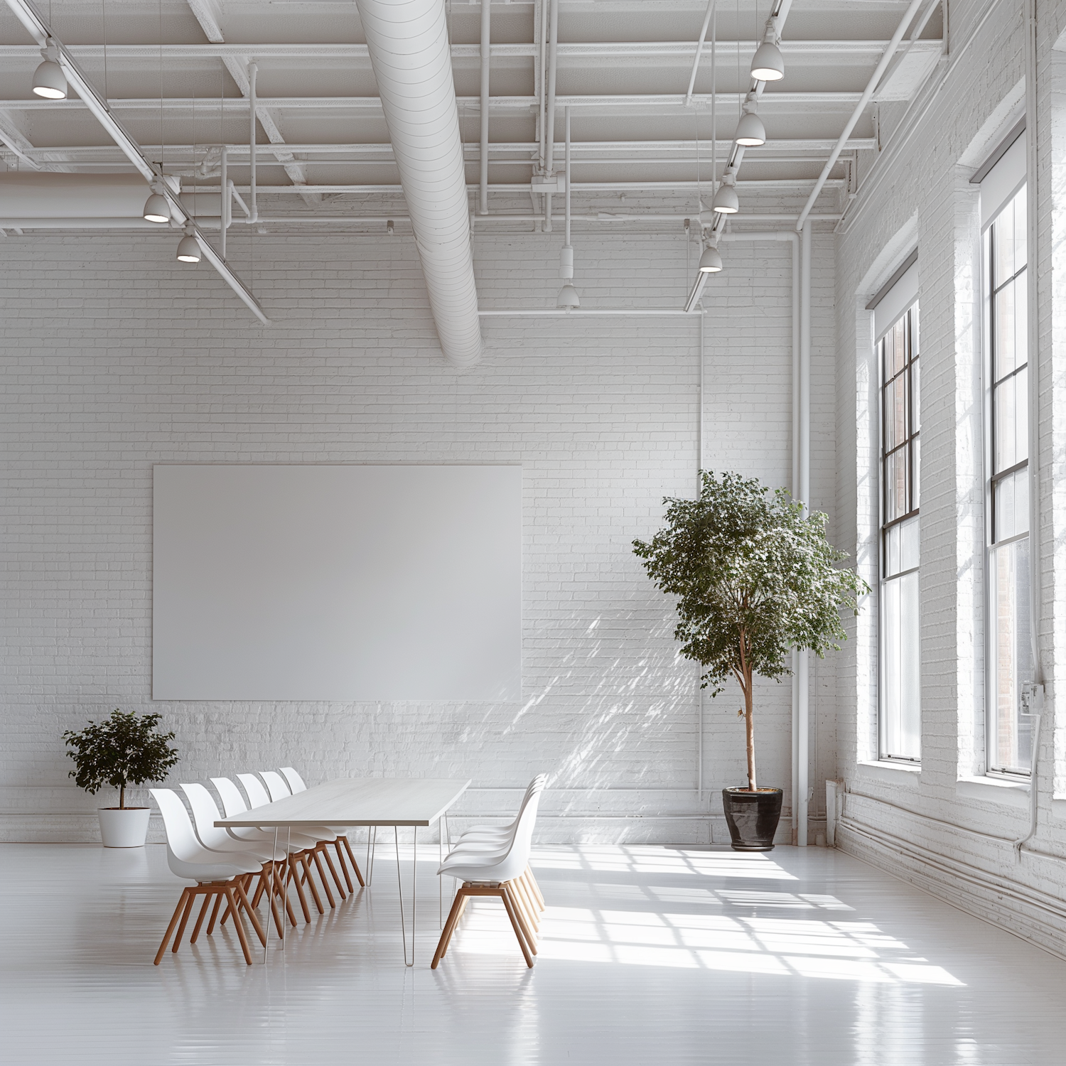 Minimalist office space with white decor, large windows, and potted plants. Bright and airy atmosphere with modern furnishings.