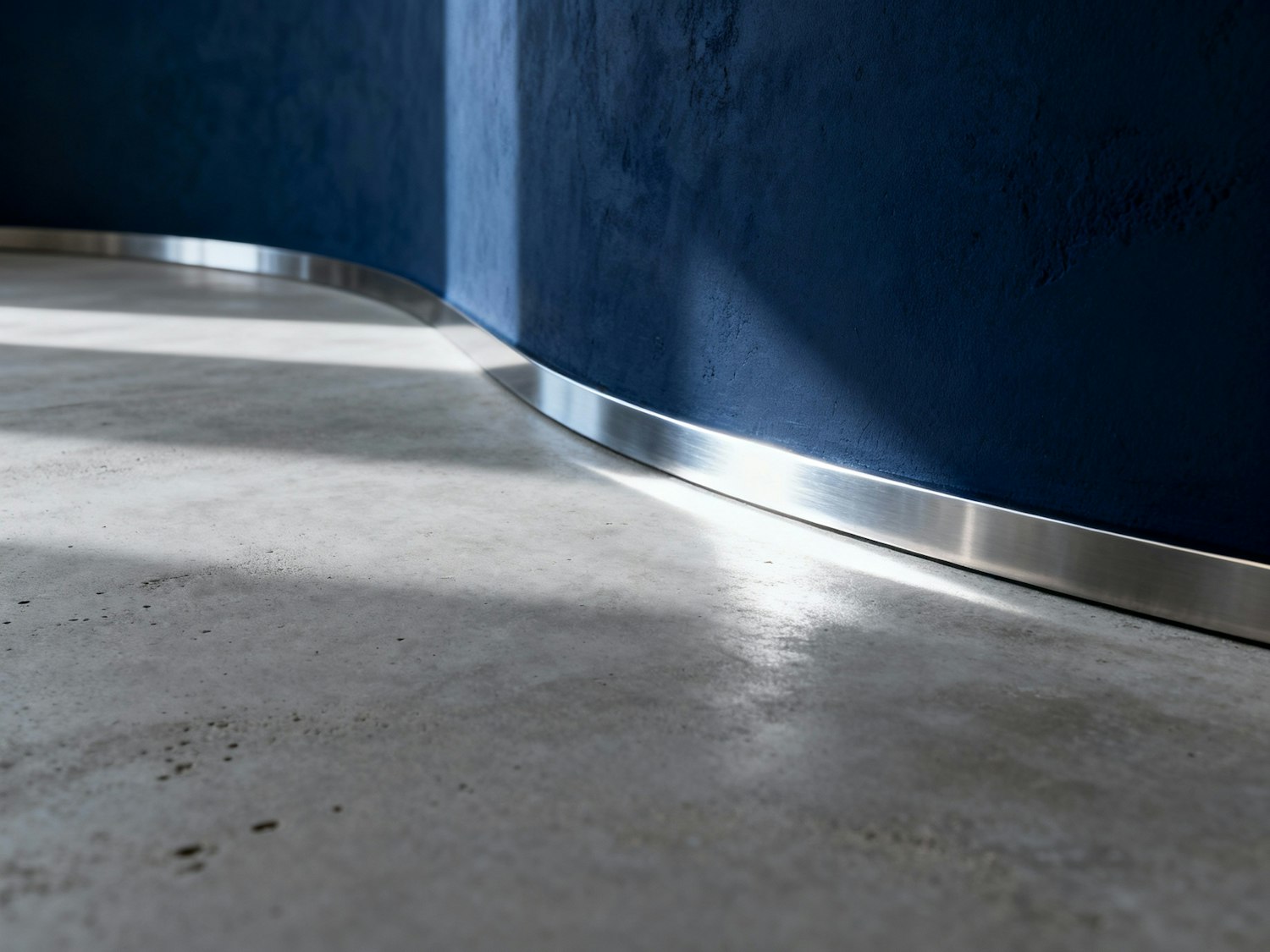 A modern interior with a navy blue curved wall, metallic baseboard, and polished concrete floor, illuminated by soft natural light.