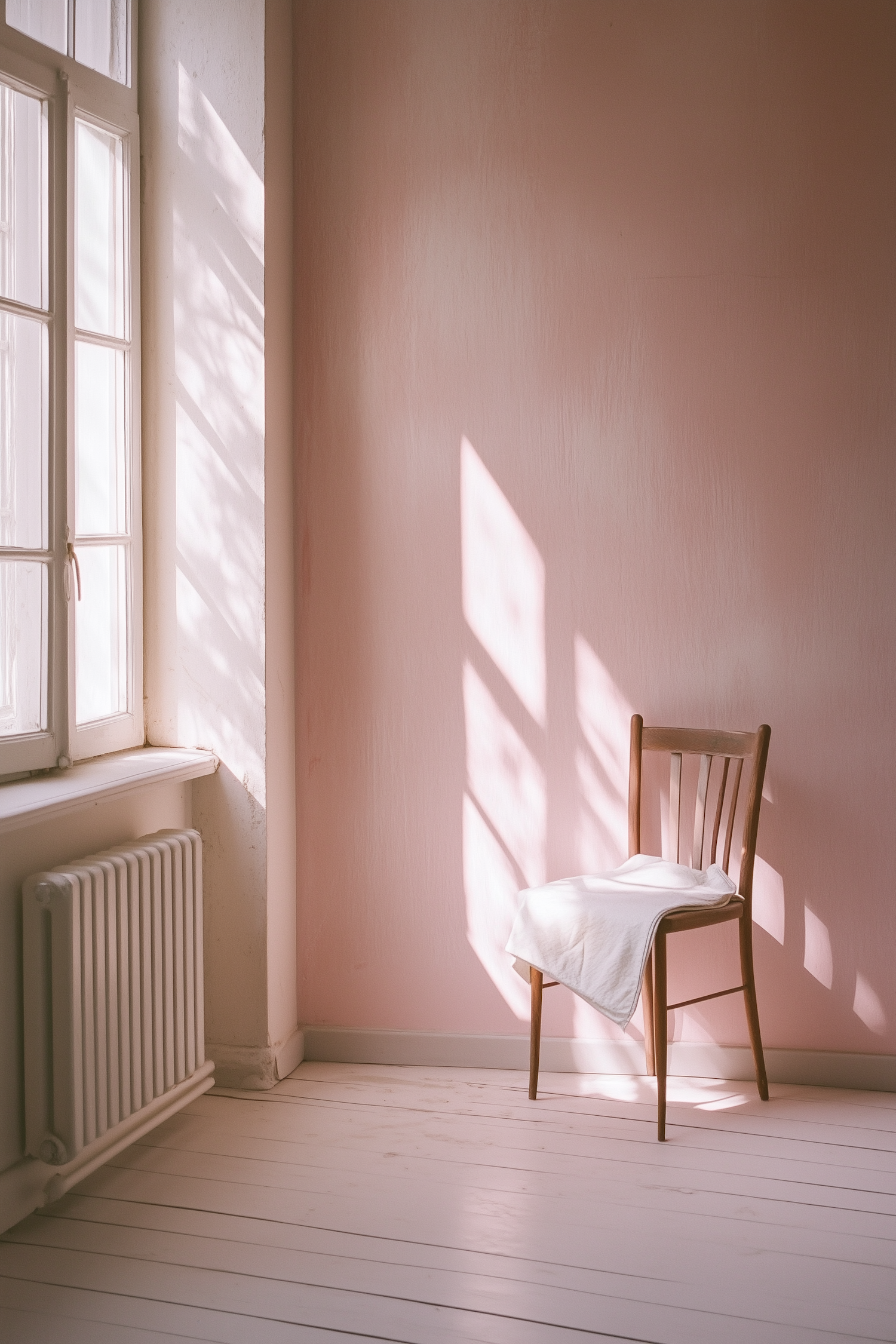 Minimalist interior with a wooden chair, pastel pink wall, white cloth, and sunlight streaming through a window casting shadows.