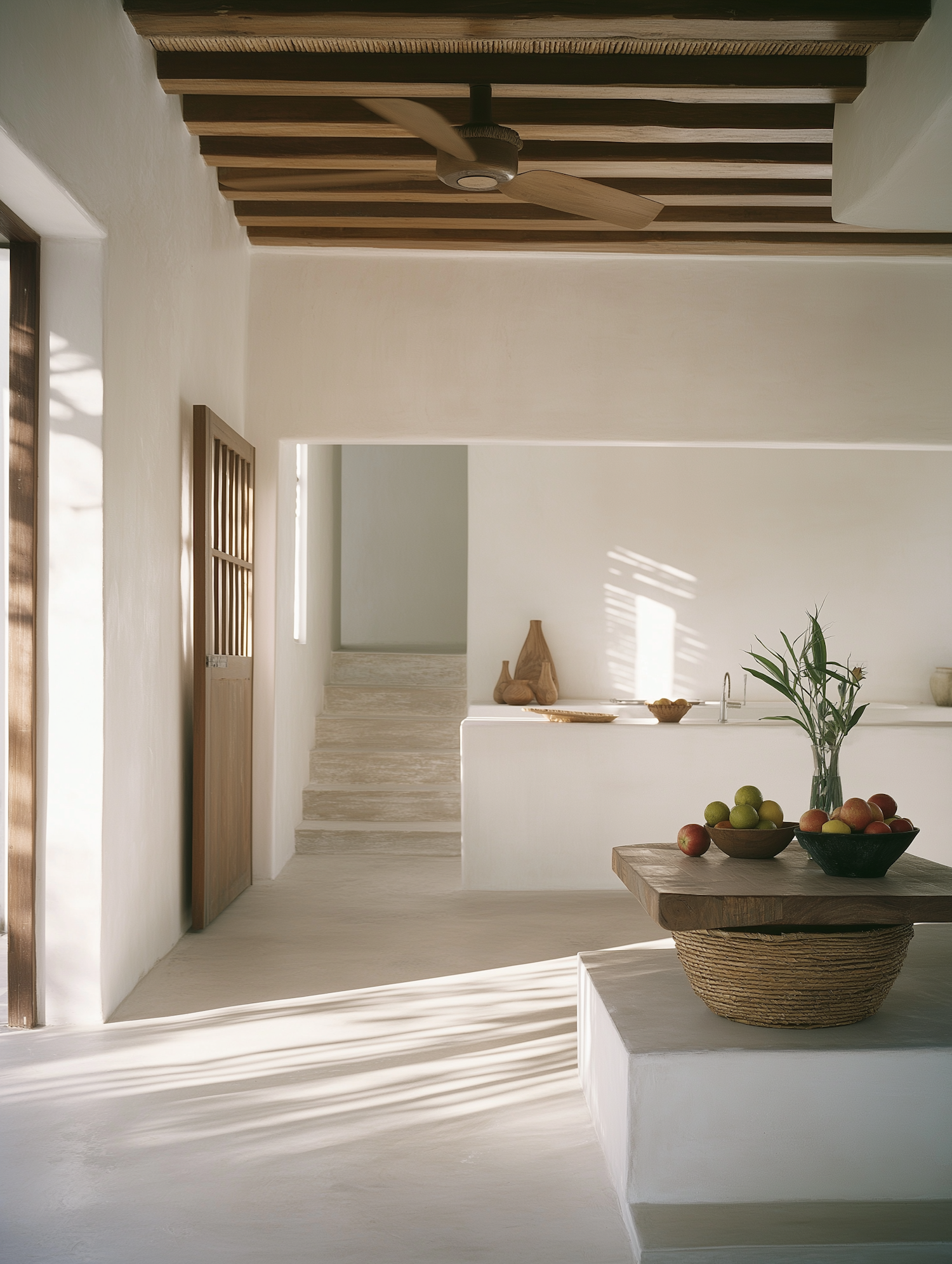 Minimalist interior with natural light, wooden beams, and earthy decor. Features a fruit-laden table and clean, white kitchen design.
