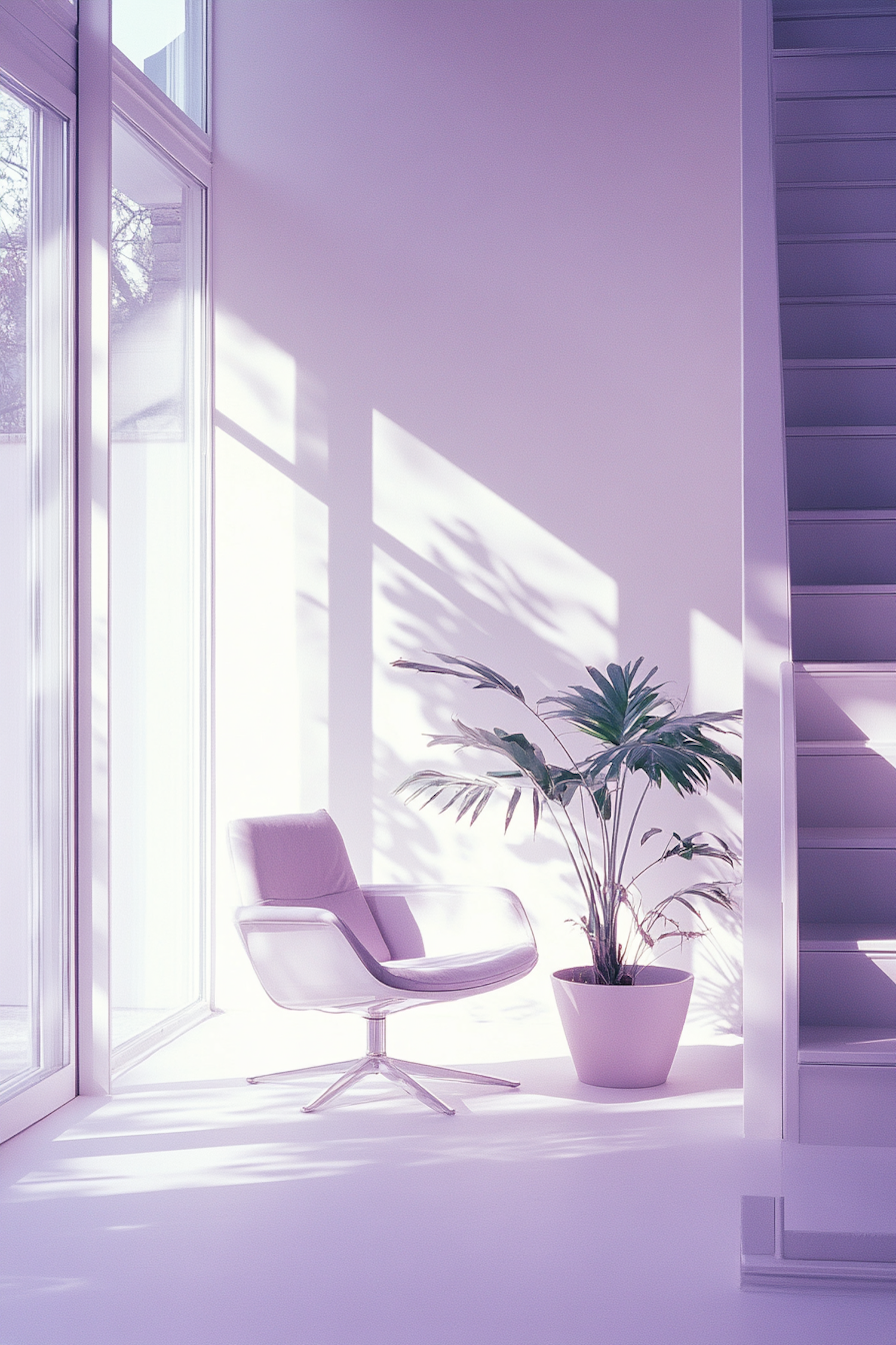 Minimalist interior with a pastel purple chair, potted plant, and sunlight streaming through tall windows, creating soft shadows.