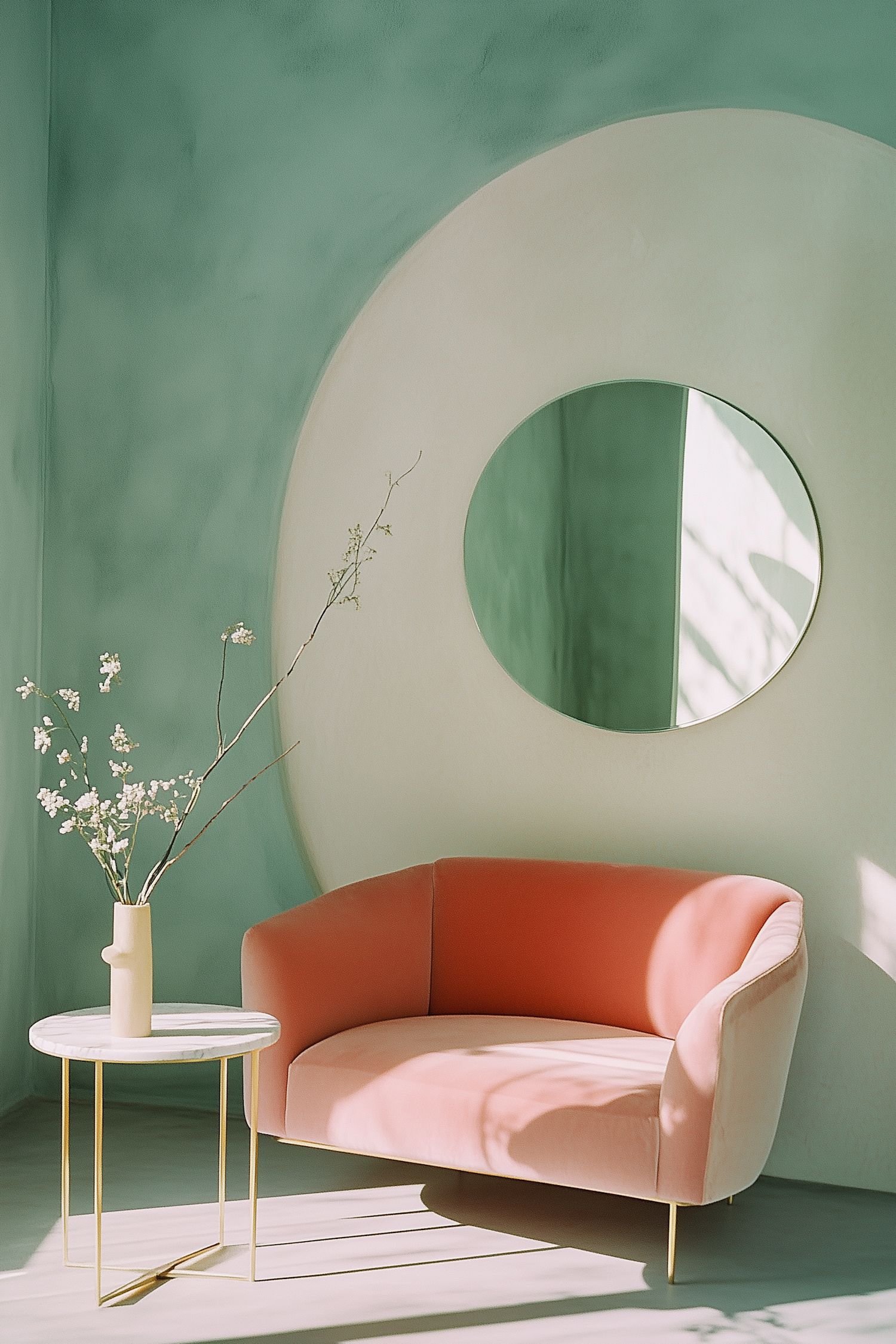 Minimalist interior with pink velvet loveseat, pastel green wall, circular mirror, and marble side table with floral vase in soft sunlight.