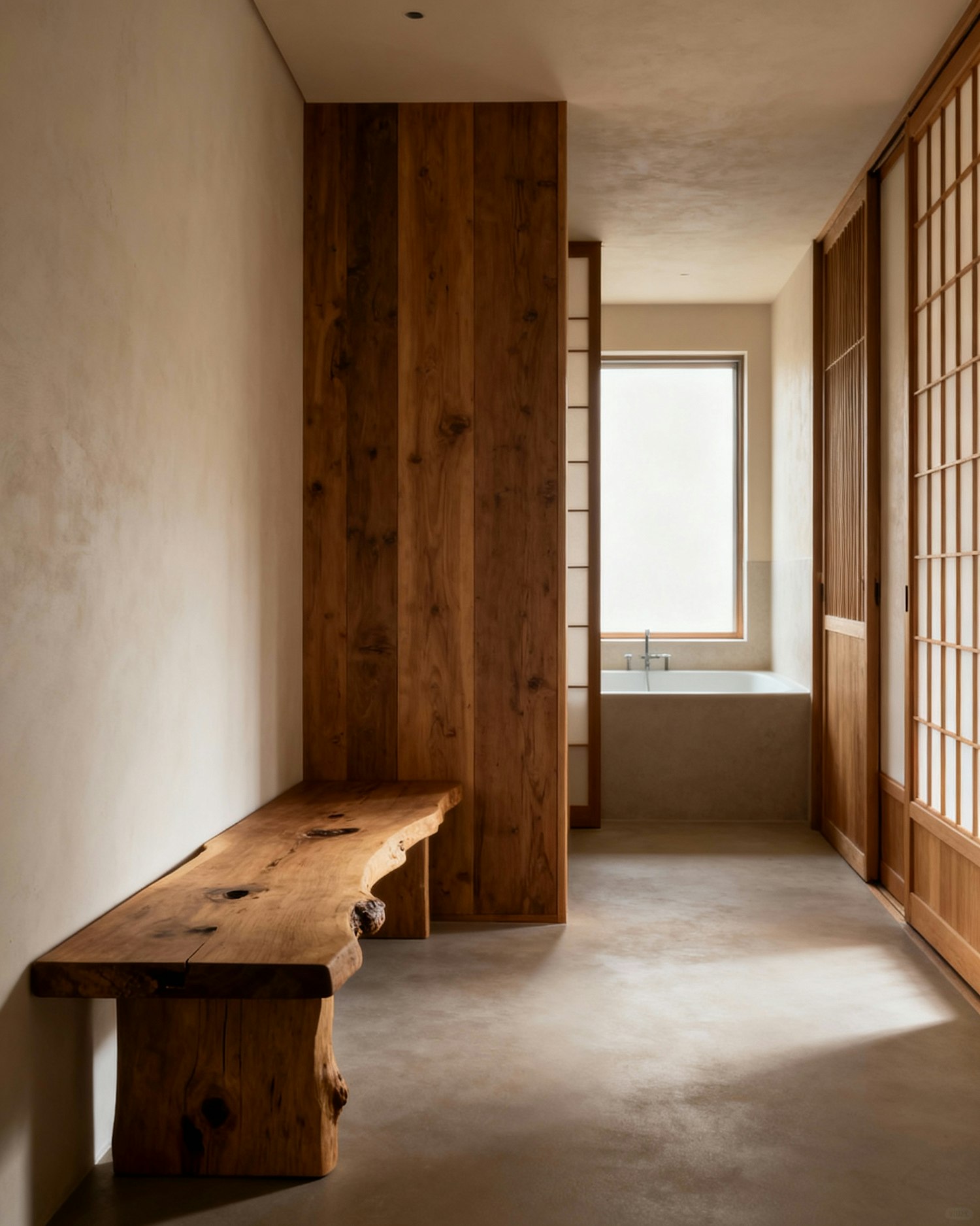 Minimalist interior with a rustic wooden bench, natural light, and a modern bathtub, blending traditional and contemporary design elements.