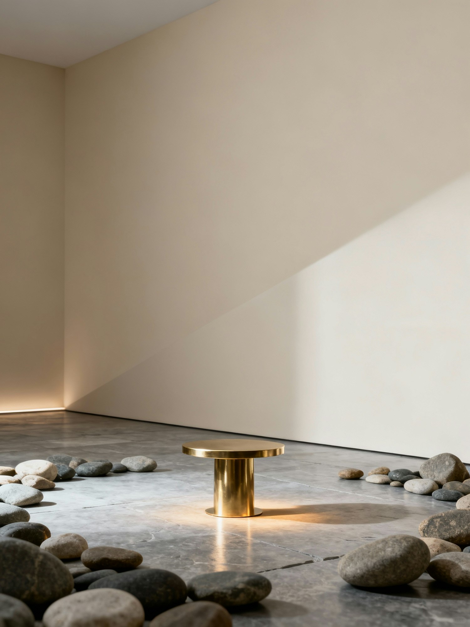 A refined cinematic studio scene, no products. Neutral bone-colored wall meeting smooth cool stone floor. A small polished brass pedestal and scattered river stones form the hero stage. Mixed light: cool daylight 5600 K with subtle warm 3200 K accent grazing brass. Lens 70 mm, f/4, 16:9 aspect, table-level. Refined, architectural, luxurious simplicity.