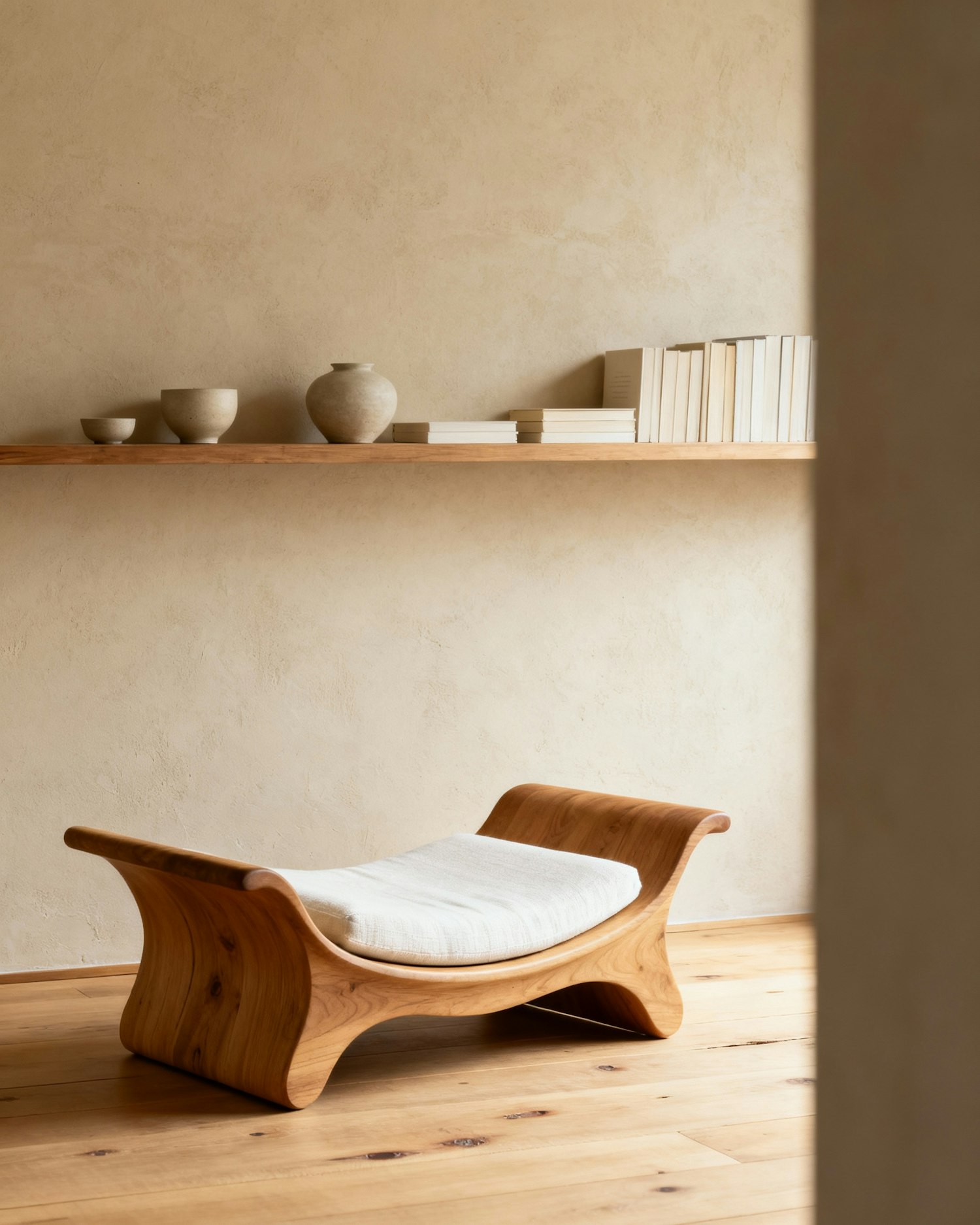 Minimalist interior with a wooden bench, ceramic vases, and books on a shelf, set against a beige textured wall and wooden floor.