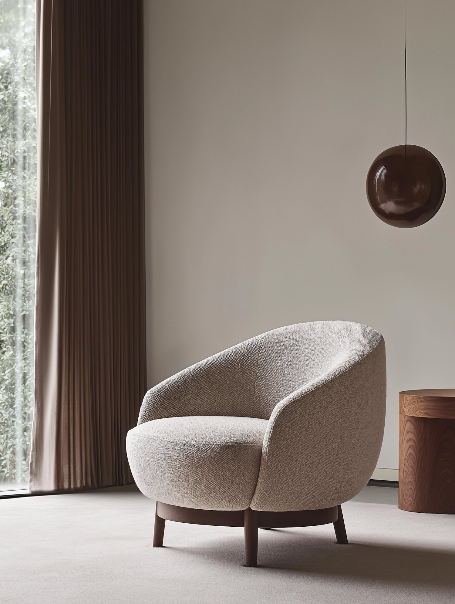 Modern beige armchair with wooden base, paired with a wooden side table and a brown pendant light in a serene, minimalist interior.