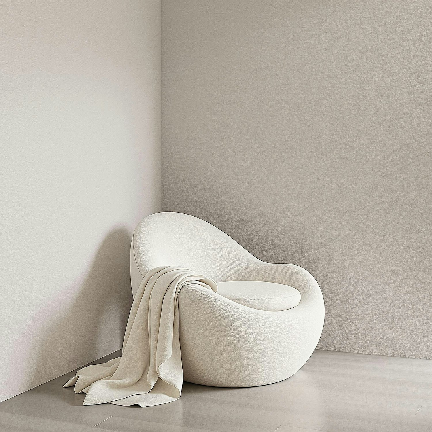 Minimalist white armchair with a soft blanket draped over it, set against light beige walls and a wooden floor for a cozy, modern vibe.