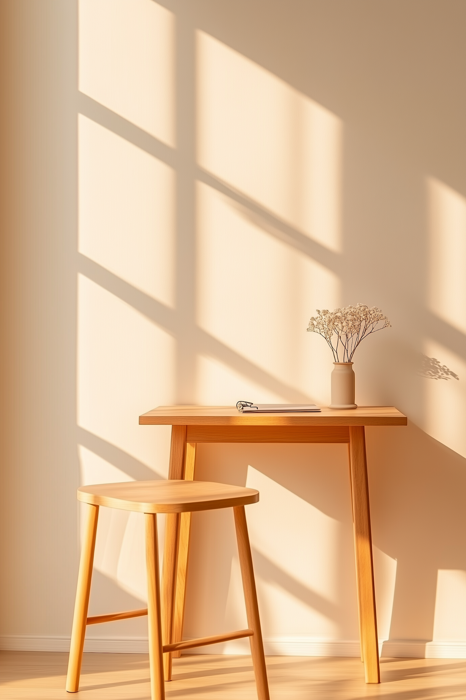 Minimalist room with wooden table and stool, sunlight casting shadows on beige wall, vase with dried flowers, and a notebook.