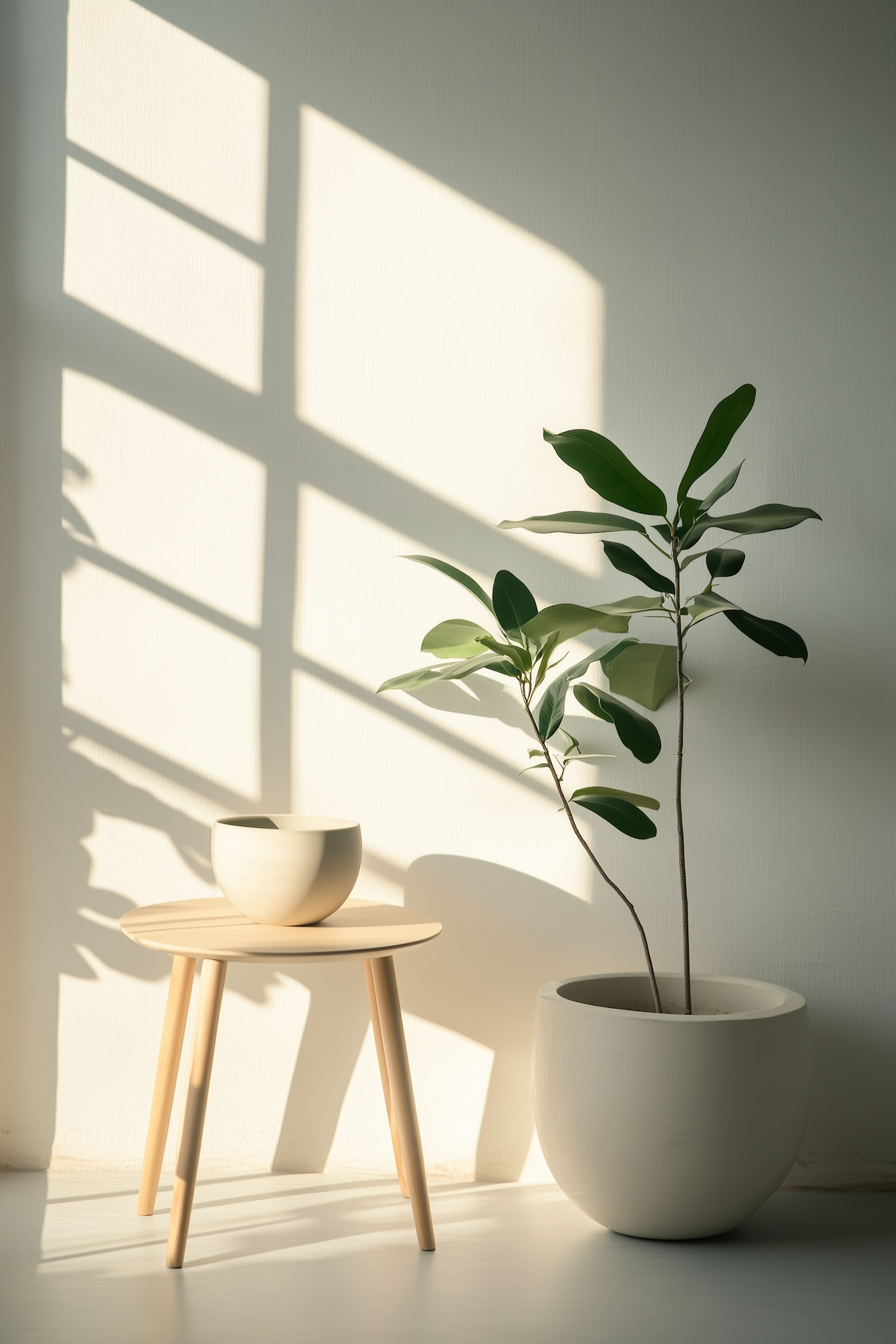 Minimalist decor with a wooden table, ceramic bowl, and a potted plant in soft natural light. Perfect for modern, serene interiors.