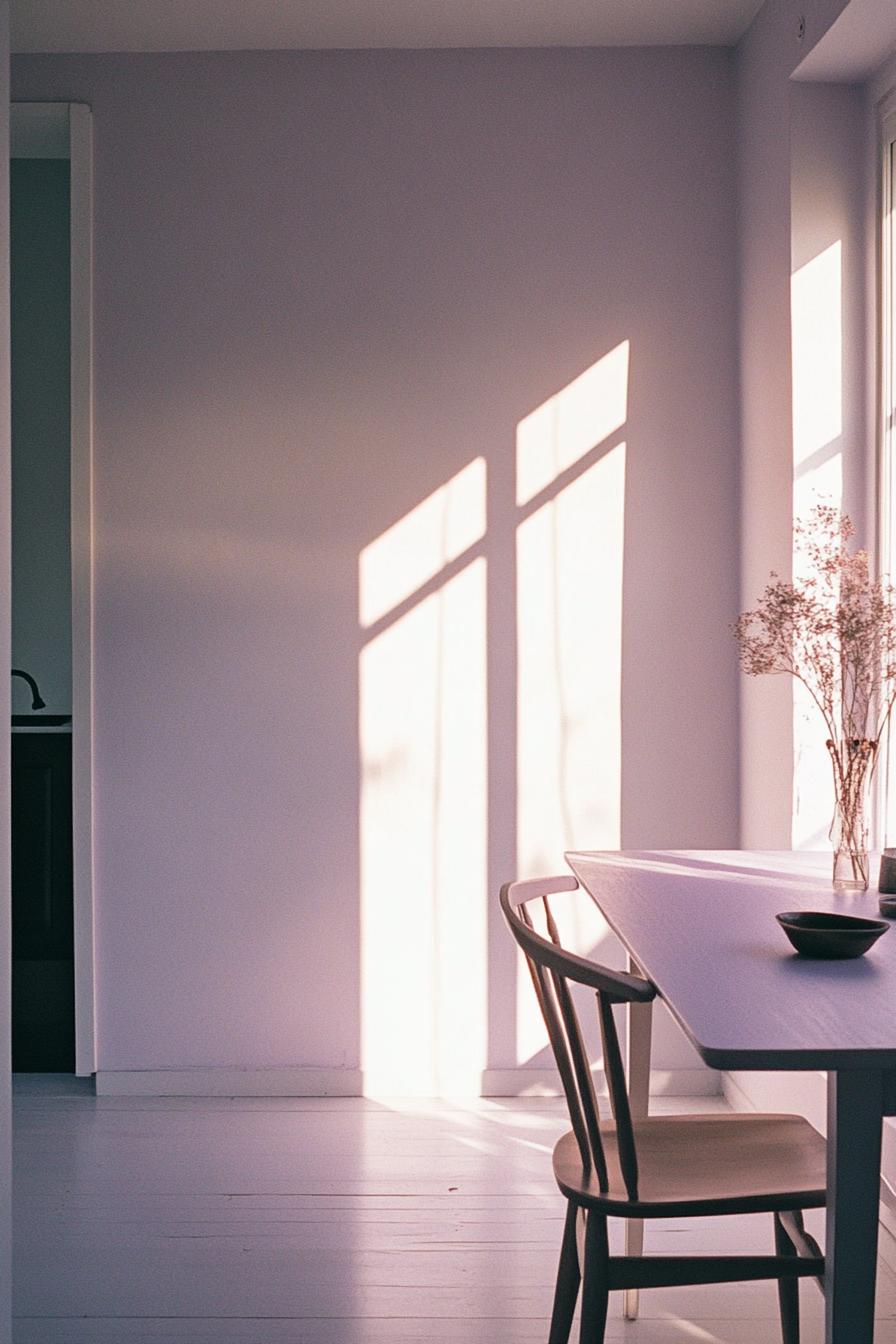 Minimalist dining area with soft light, a wooden chair, dried flowers in a vase, and a sleek table. Perfectly serene and modern.