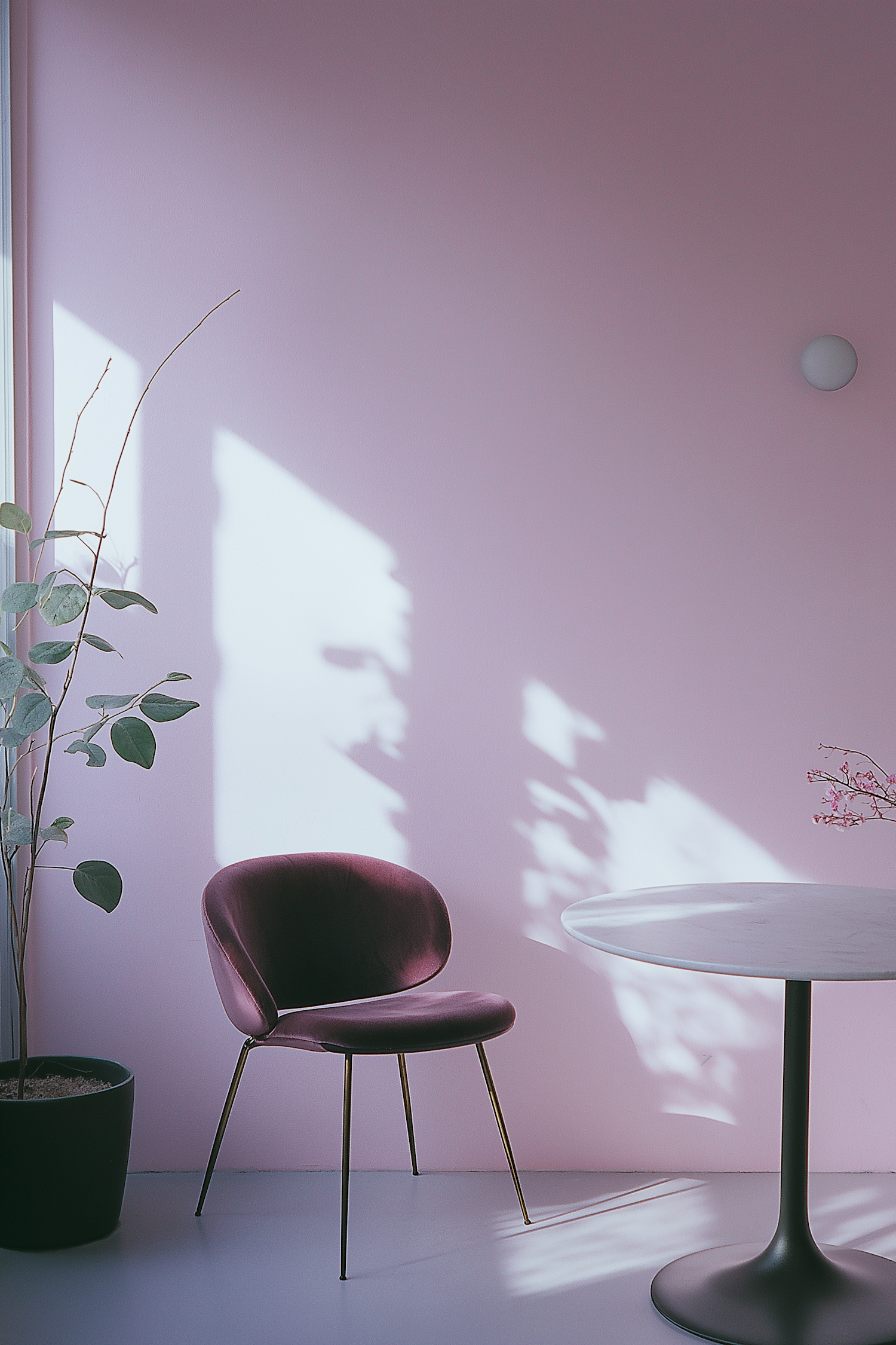 Minimalist pink room with a burgundy velvet chair, marble table, and leafy plant. Sunlight casts soft shadows, creating a serene vibe.