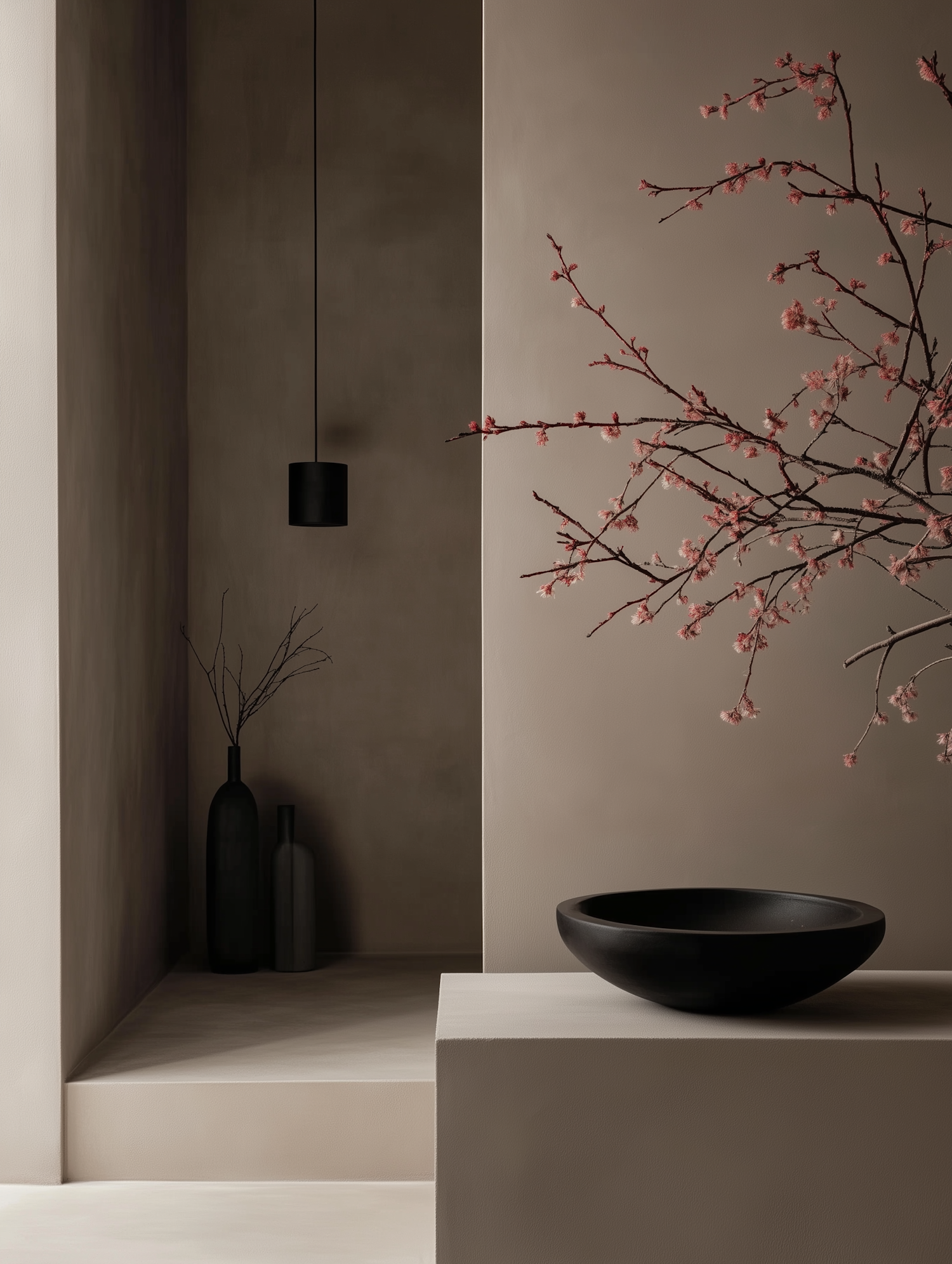 Minimalist interior with black accents, pink blossoms, and neutral tones. Features a black bowl, vases, and pendant light for a serene vibe.