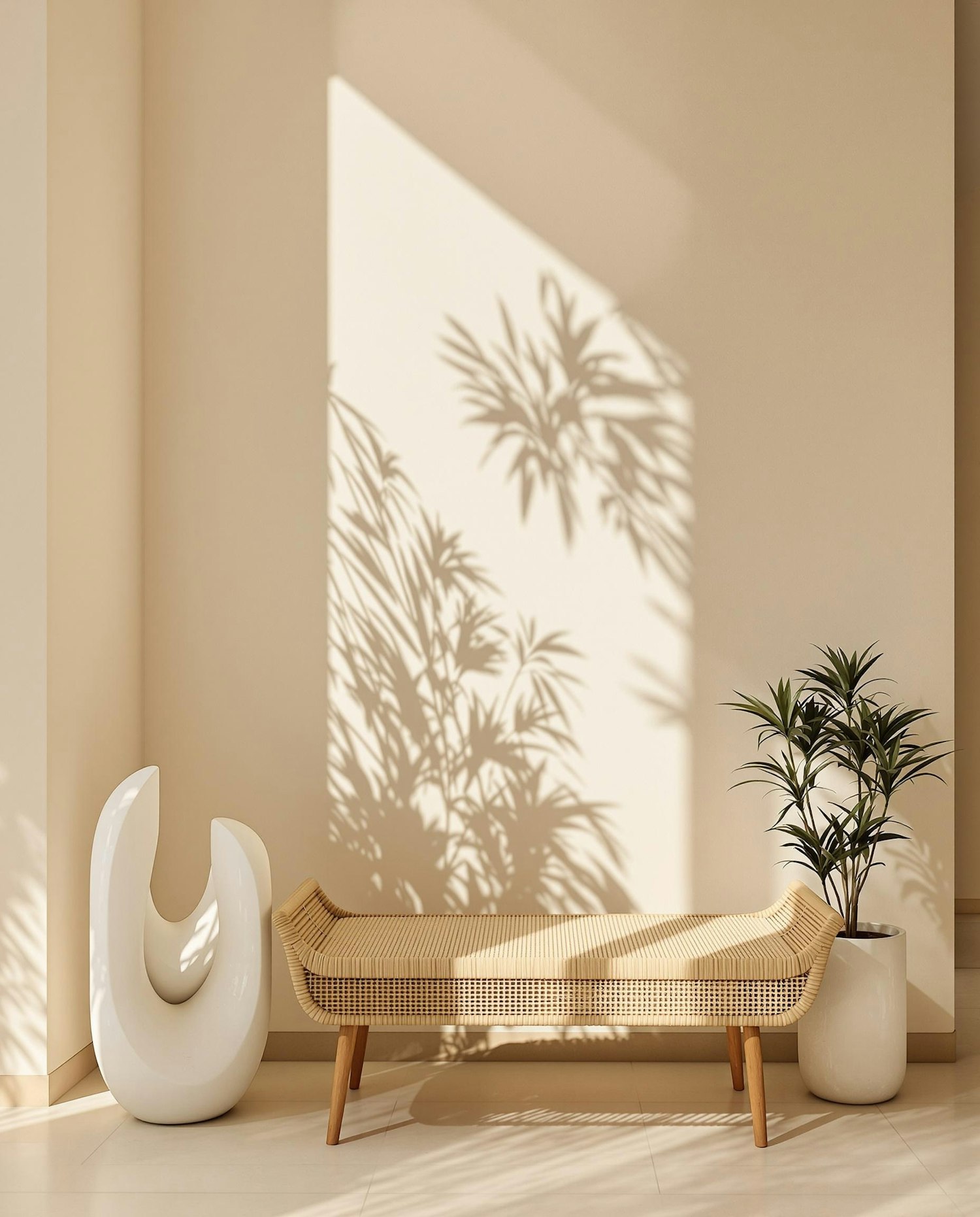 Minimalist interior with a rattan bench, abstract sculpture, and potted plant. Sunlight casts leaf shadows on a beige wall for a serene vibe.