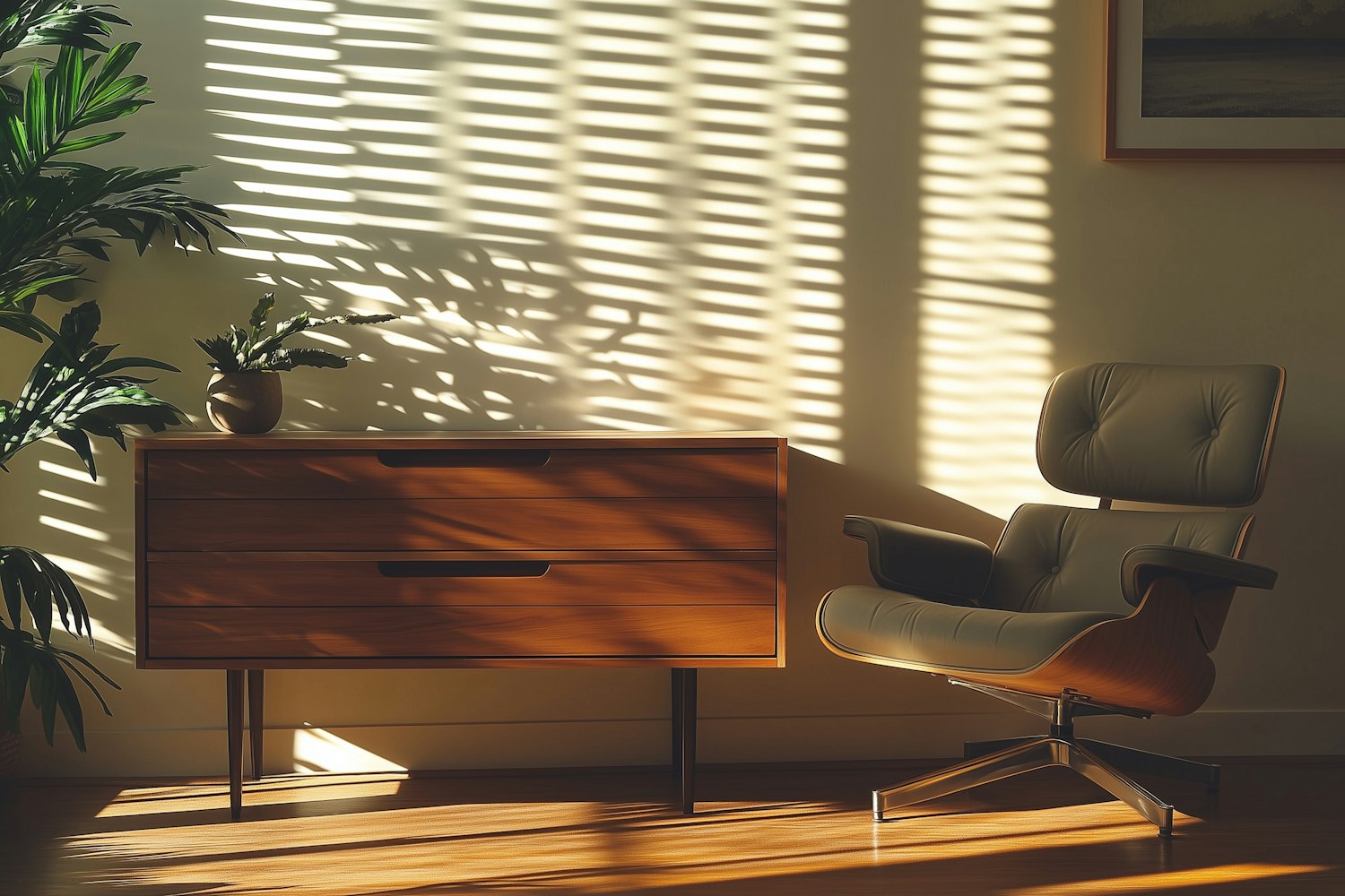 Sunlit modern interior with a wooden dresser, potted plant, and a stylish lounge chair. Warm tones and shadows create a cozy ambiance.