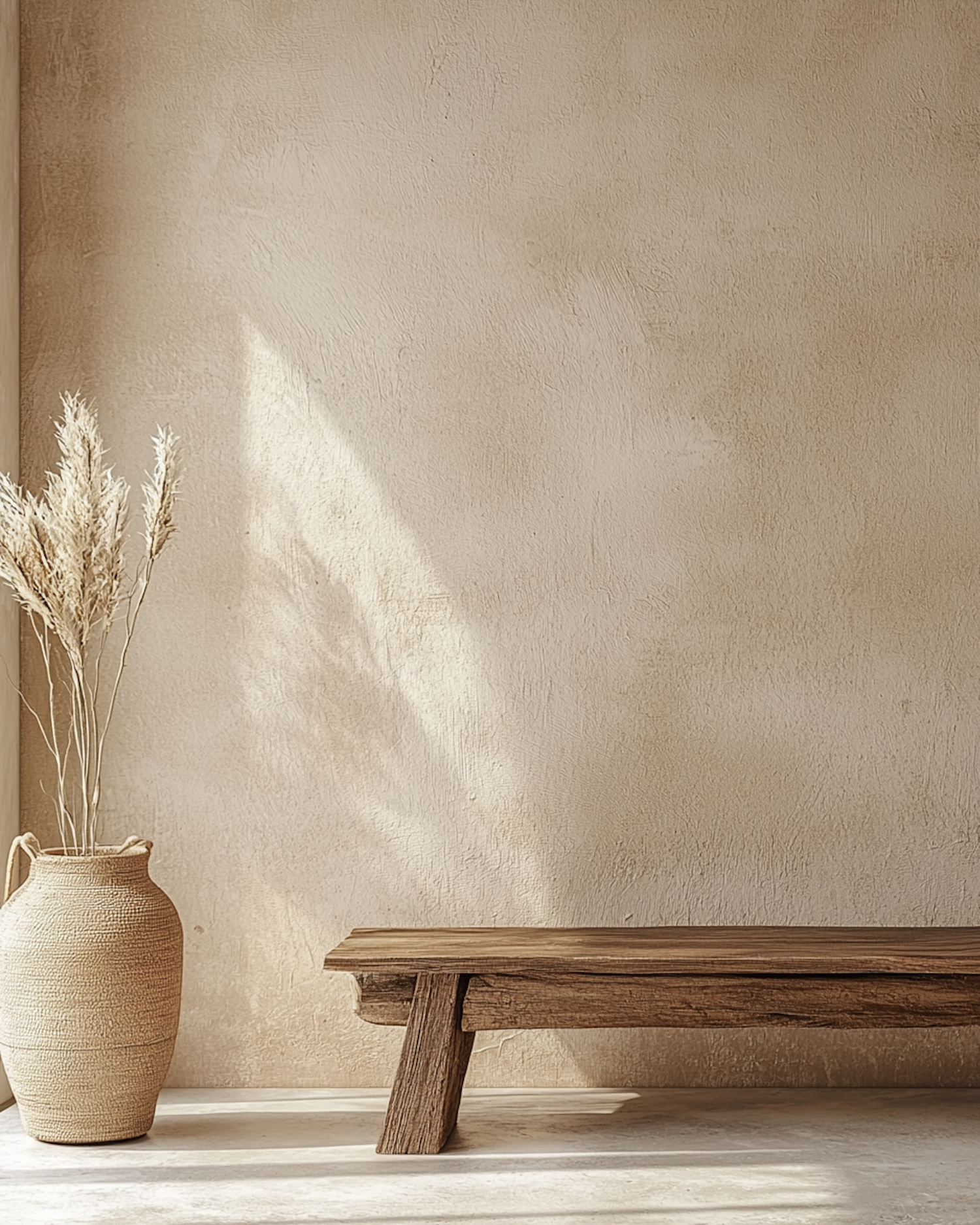 Minimalist decor with a rustic wooden bench, woven vase, and pampas grass against a textured beige wall in soft sunlight.
